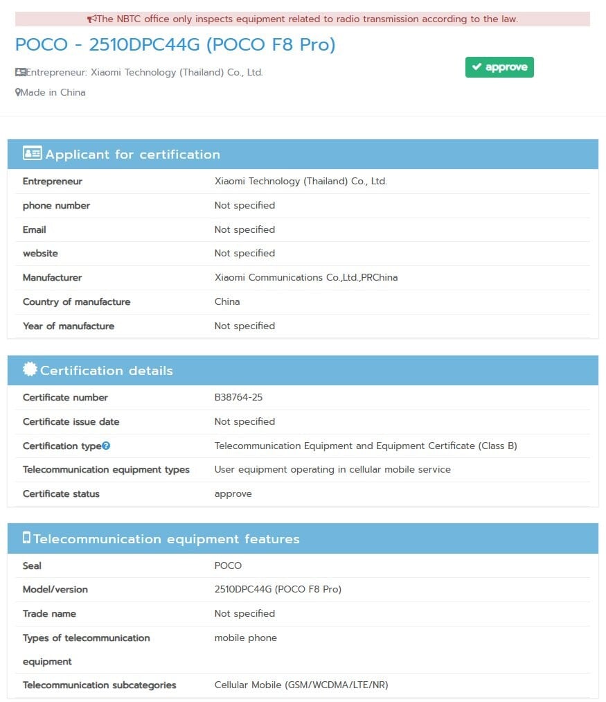 目前,该公司尚未正式透露任何细节。不过,Poco F8 Pro 的存在现已通过泰国 NBTC(国家广播和电信委员会)认证得到证实。该认证没有透露该设备的任何关键规格。不过,它确认了型号为 "2510DPC44G "的手机属于全球通用的 Poco F8 Pro.