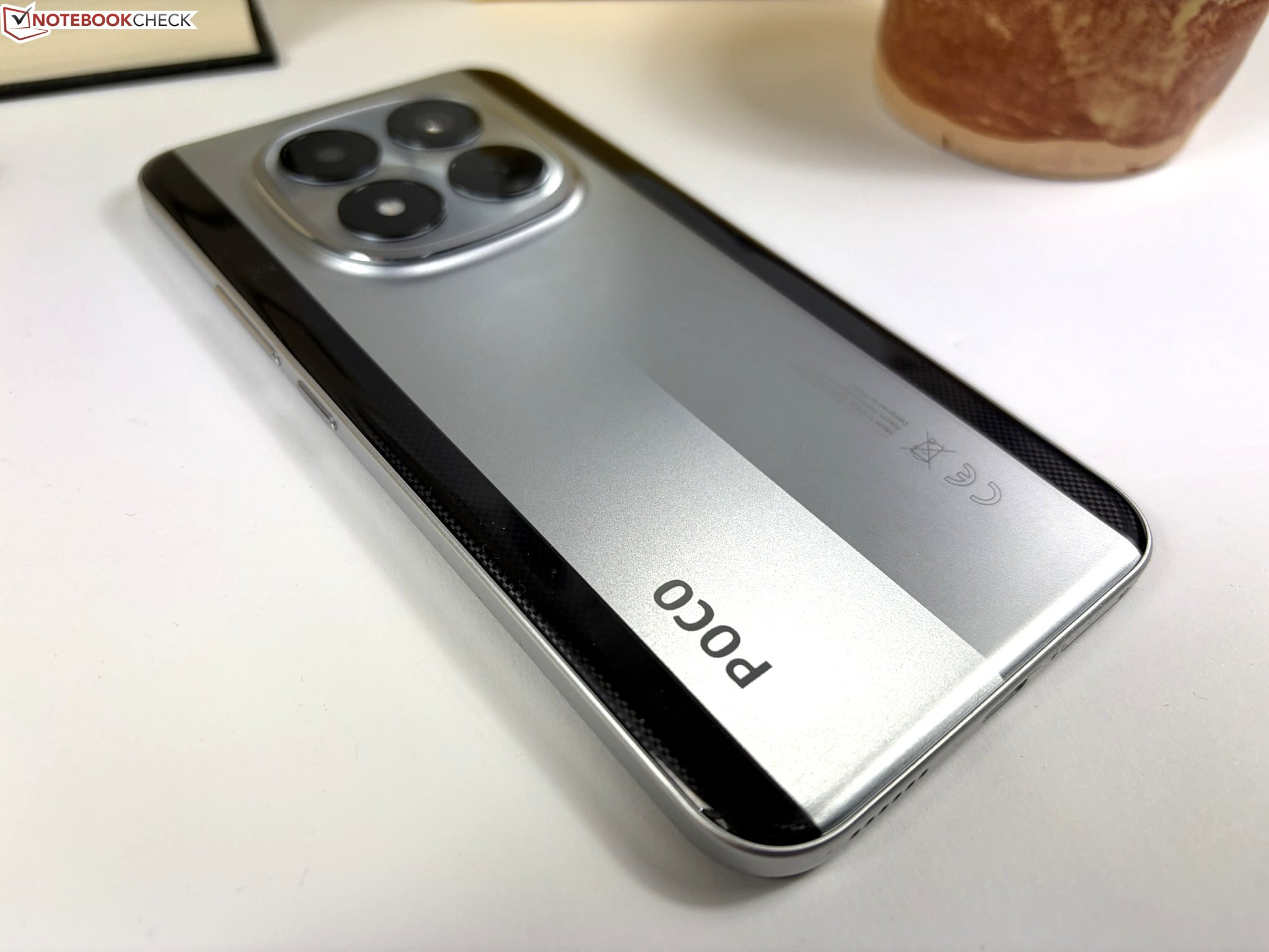 带有额外保护膜的显示屏玻璃采用大猩猩玻璃 Victus 2 制成,边角略呈圆形。加上四边非常窄的显示屏边缘,使小米手机看起来非常有质感。Poco M8 Pro 5G 采用铝制边框连接正面和背面,并通过了 IP68 防尘防水认证。