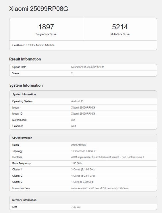 在 Geekbench 上,这款新平板电脑的型号为 "25099RP08G",据传其品牌为 Poco Pad X1。关于这款平板电脑的消息https://xiaomitime.com/poco-is-ready-to-take-over-the-tablet-market-with-the-poco-pad-x1-and-poco-pad-m1-65692/两个月前,该平板电脑被认为是 小米 Pad 7.Geekbench 列表似乎也证实了这一点,因为它显示该设备配备了 Adreno 732(骁龙 7+ Gen 3 的 GPU)。 骁龙 7+ 第三代的 GPU。