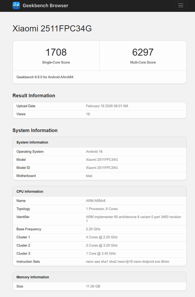 相反,所有的 Geekbench 列表都提到了 2511FPC34G,该型号的后缀 G 表示全球发布。考虑到之前的泄露信息,基准测试的设备更可能是 Poco X8 Pro,而不是传闻中的 Poco X8 Pro Max。 此外,Geekbench 还显示 2511FPC34G 采用的是 Dimensity 8500 系列芯片组,而不是 Dimensity 9500s据说 Poco X8 Pro Max 采用的是 Dimensity 9500s。