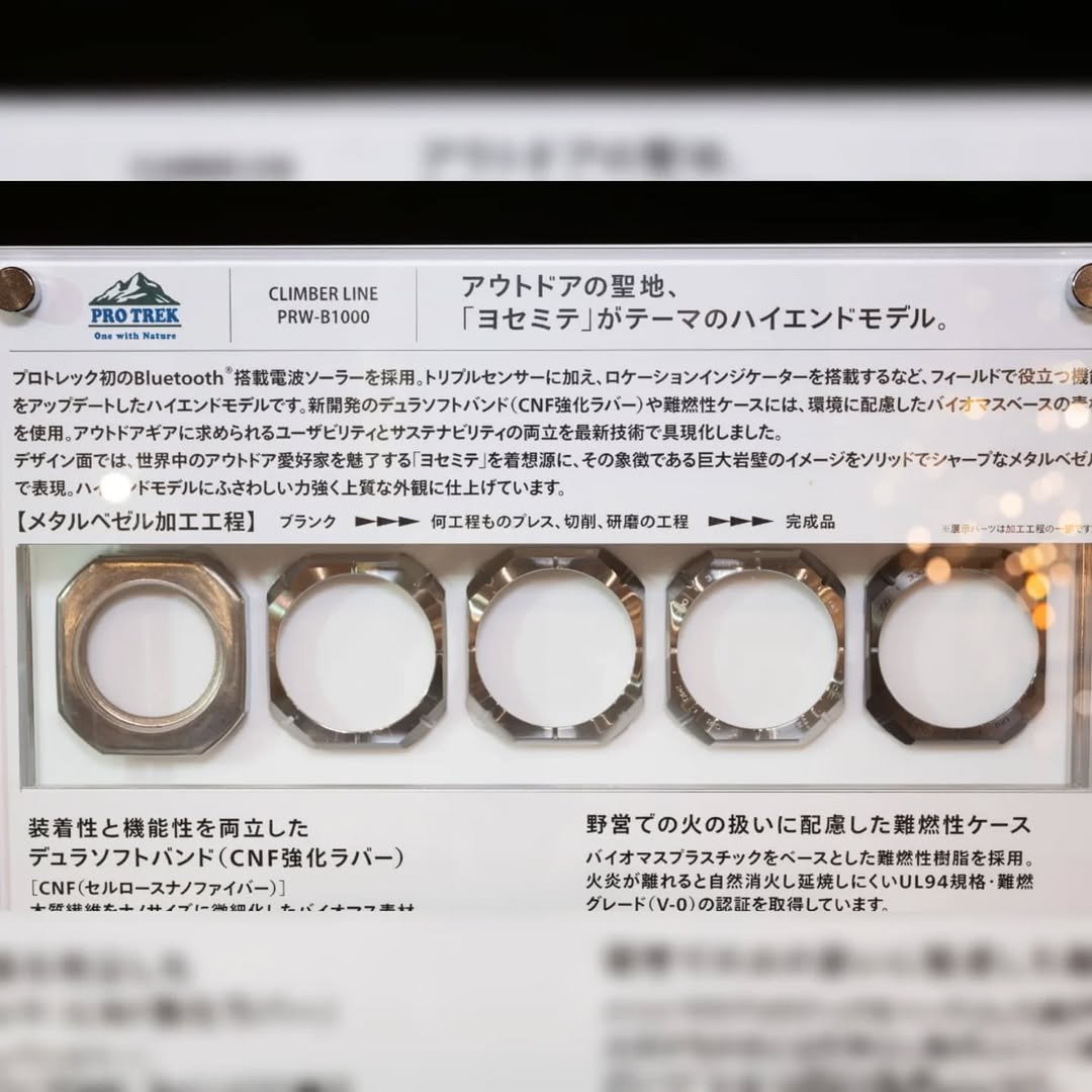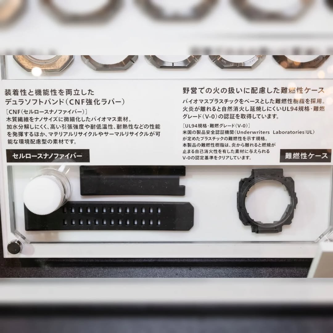 展示还显示了卡西欧使用纤维素纳米纤维(CNF)增强橡胶制成的表带,具有卓越的耐磨性,并集成了环保生物塑料。专门的展示文字强调了表带和表壳的阻燃认证,该认证是通过使用 UL94 V-0 级材料实现的,这对于野外安全使用非常重要。