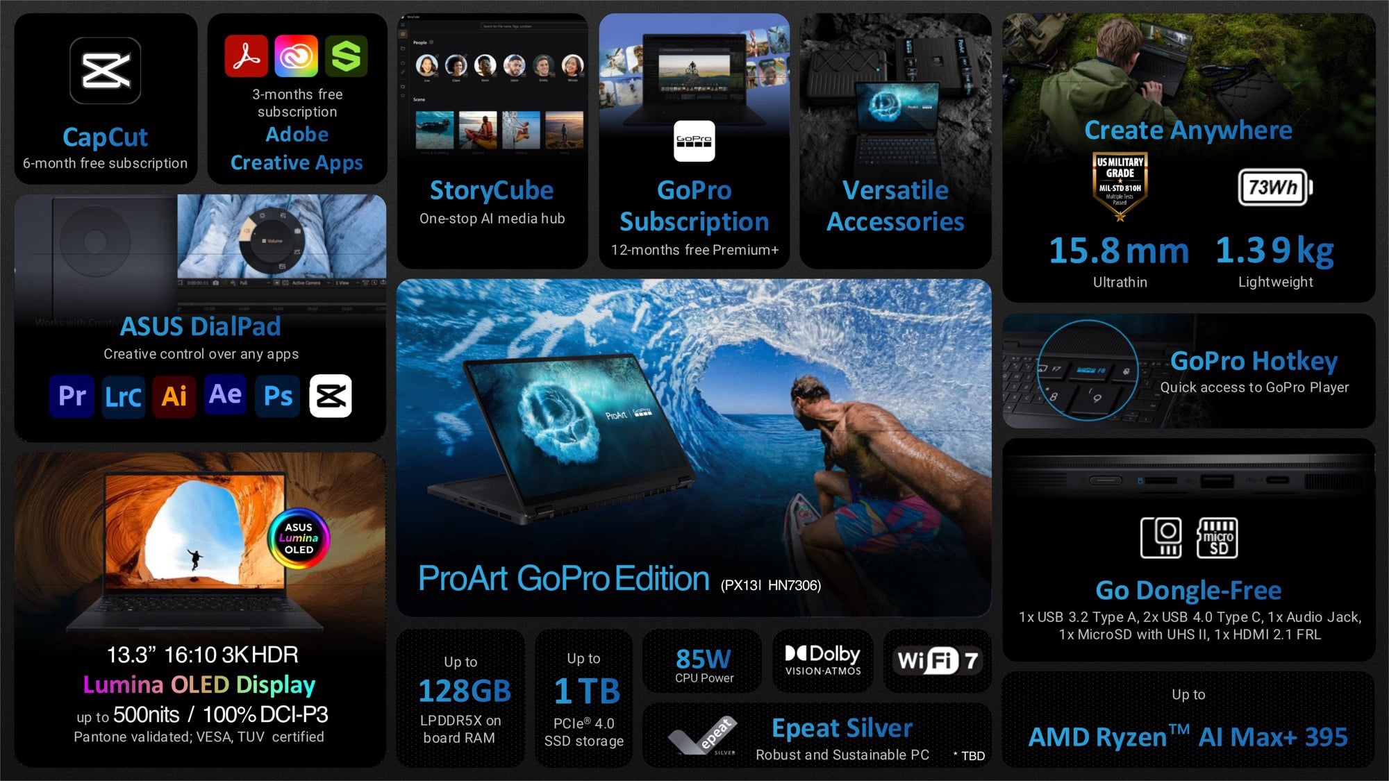 尽管如此,ProArt PX13 的重量仍保持不变,仍为 1.38 千克。此外,华硕继续安装 73 Wh 电池,但支持 130 W USB Type-C 充电。13.3 英寸和 2.8K OLED 显示屏也回归了,不过其最高频率仍为 60 Hz 和 400 尼特。与此同时,GoPro Edition 采用了更加坚固的外观,键盘快捷键可用于打开预装的 GoPro Player 应用程序,并附带 12 个月的 GoPro Premium Plus 订阅。