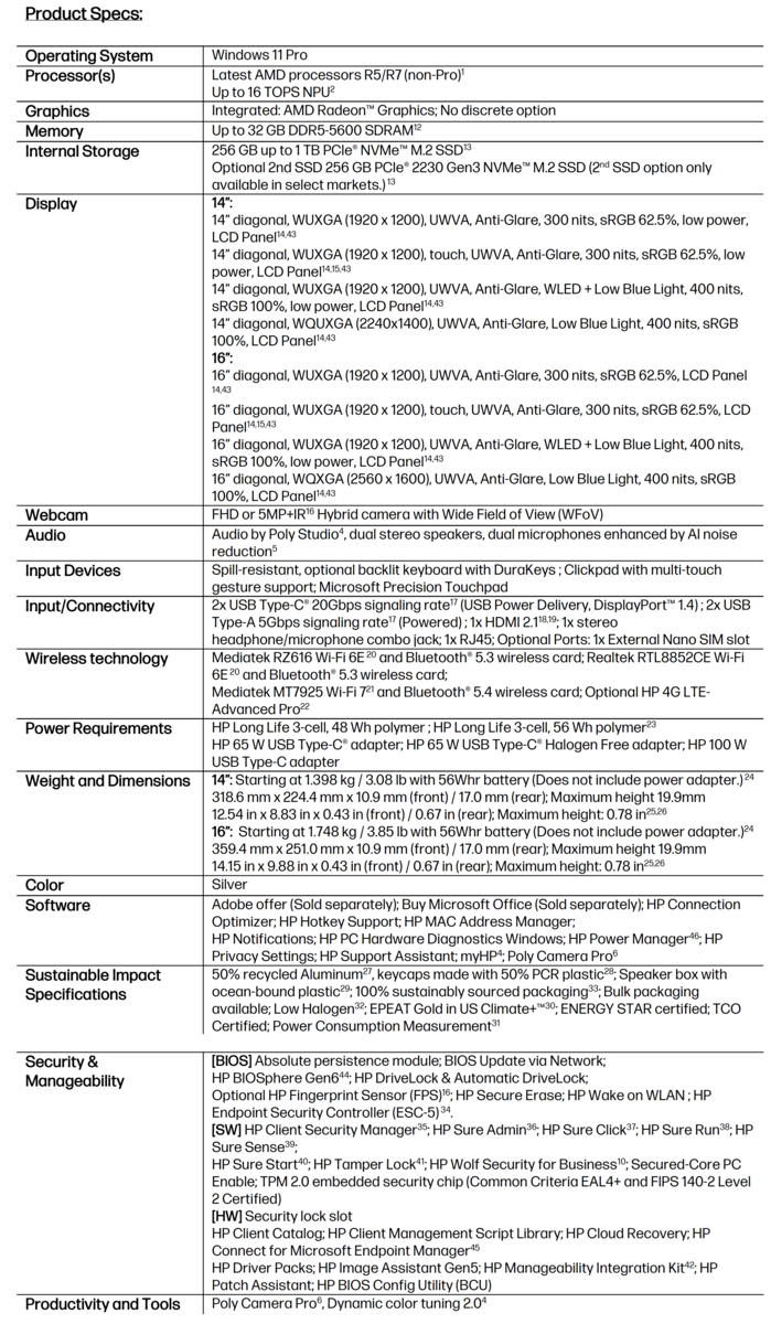 ProBook 4 G1a 14 和 ProBook 4 G1a 16 均配备最高 32 GB DDR5-5600 SDRAM 内存和最高 1 TB NVMe SSD。
