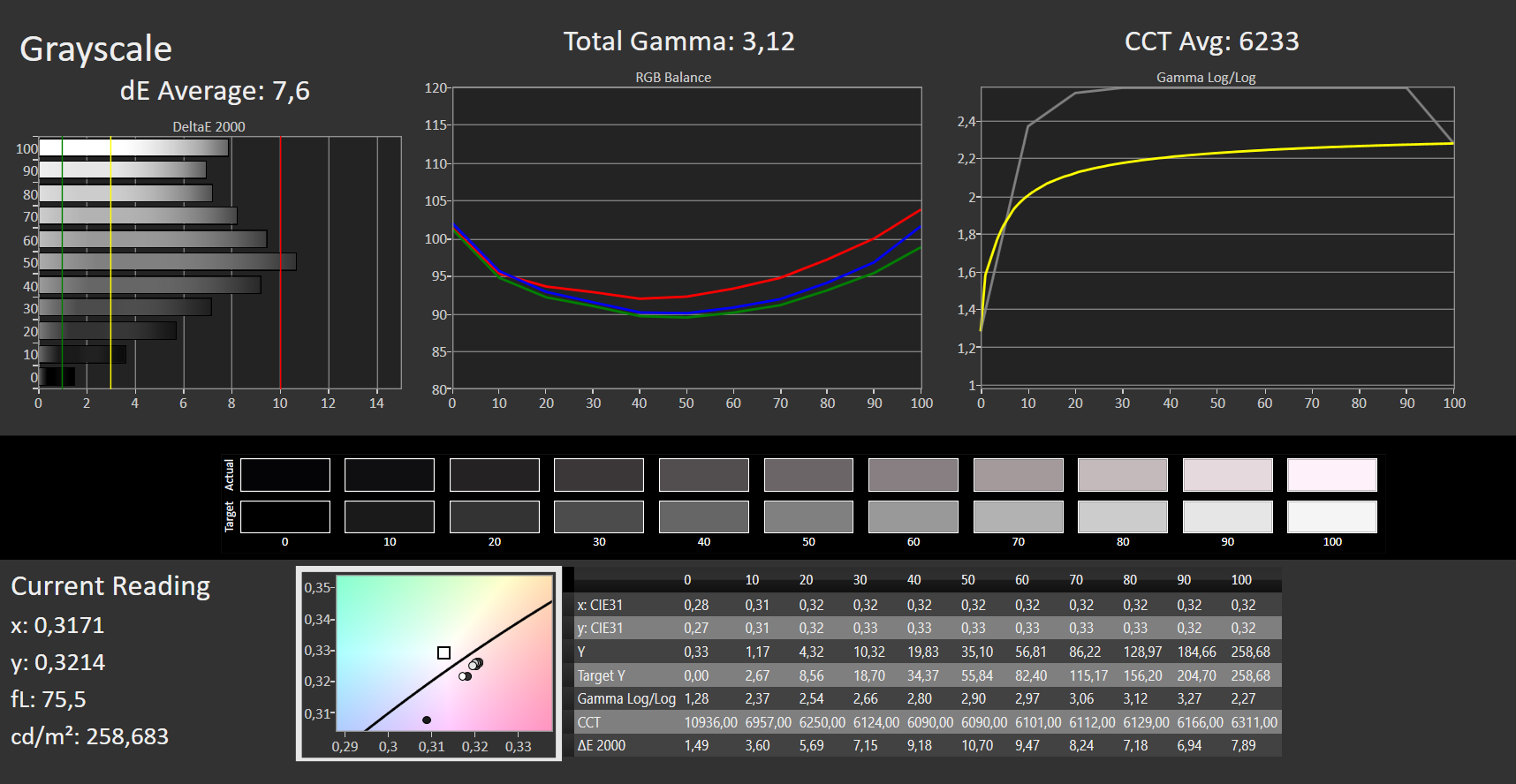ΔE Greyscale Calman: 7.6 | ∀{0.09-98 Ø5}