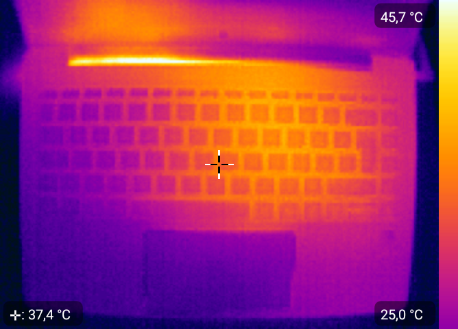 (+) The palmrests and touchpad are cooler than skin temperature with a maximum of 31.6 °C / 88.9 F and are therefore cool to the touch.