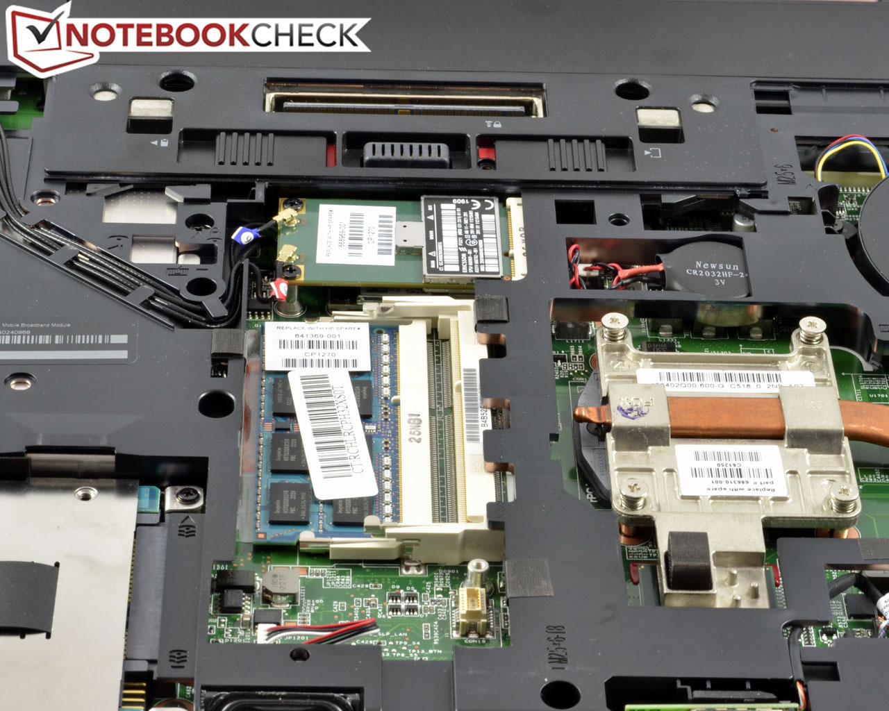 After opening the notebook a matte 15.6 inch display which precisely nestles into a matte black display frame reveals itself. The keyboard is also composed out of a non-reflective material, and the extremely stable palm resting area consists of brushed aluminium which only dents inwards slightly above the optical drive with a lot of pressure. The chiclet keyboard contains a separate numeric keypad. Underneath the ProBook 6570b, the base unit is composed out of a matte black plastic which is very stiff. Via a sliding mechanism the large maintenance panel can be unlocked, which allows almost the whole of the bottom to be removed. Beneath this nearly all the components are easily accessible. Along with the hard drive there are also the WLAN and the WWAN modules, two RAM slots and the BIOS battery among other things. The cooling fan can also be reached just as easily, and can therefore also be cleaned if necessary. Even the processor and the graphics card can be upgraded. The 55 Wh battery can also be unlocked and removed via a separate sliding mechanism, revealing the SIM card slot under it. Alternatively, the ProBook 6570b can also be fitted with and HDD and an mSATA connected SSD simultaneously, in which case the UMTS module has to be forgone. The inherently solid manufacturing quality and high level of upgradability altogether leave a very good impression.