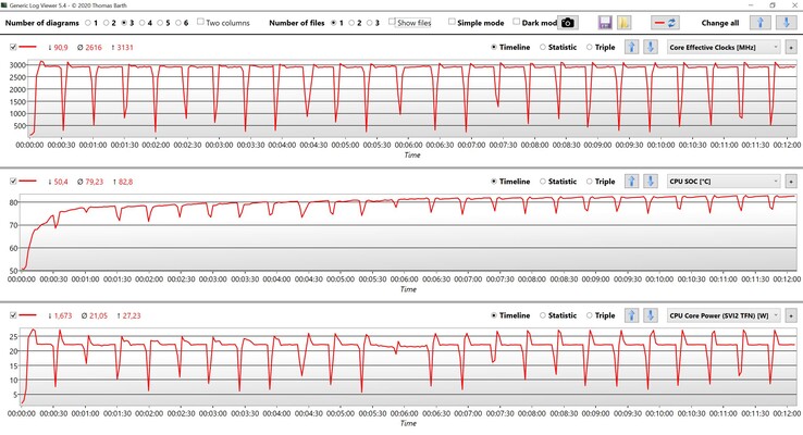 在轻载情况下,ProBook比它的直接竞争对手略为节俭。 前辈.除了更高效的处理器,更暗的显示屏自然也起到了作用。我们看到负载下的最大功率为47.5瓦,很快就稳定在40瓦左右。因此,附带的65瓦电源是完全足够的。