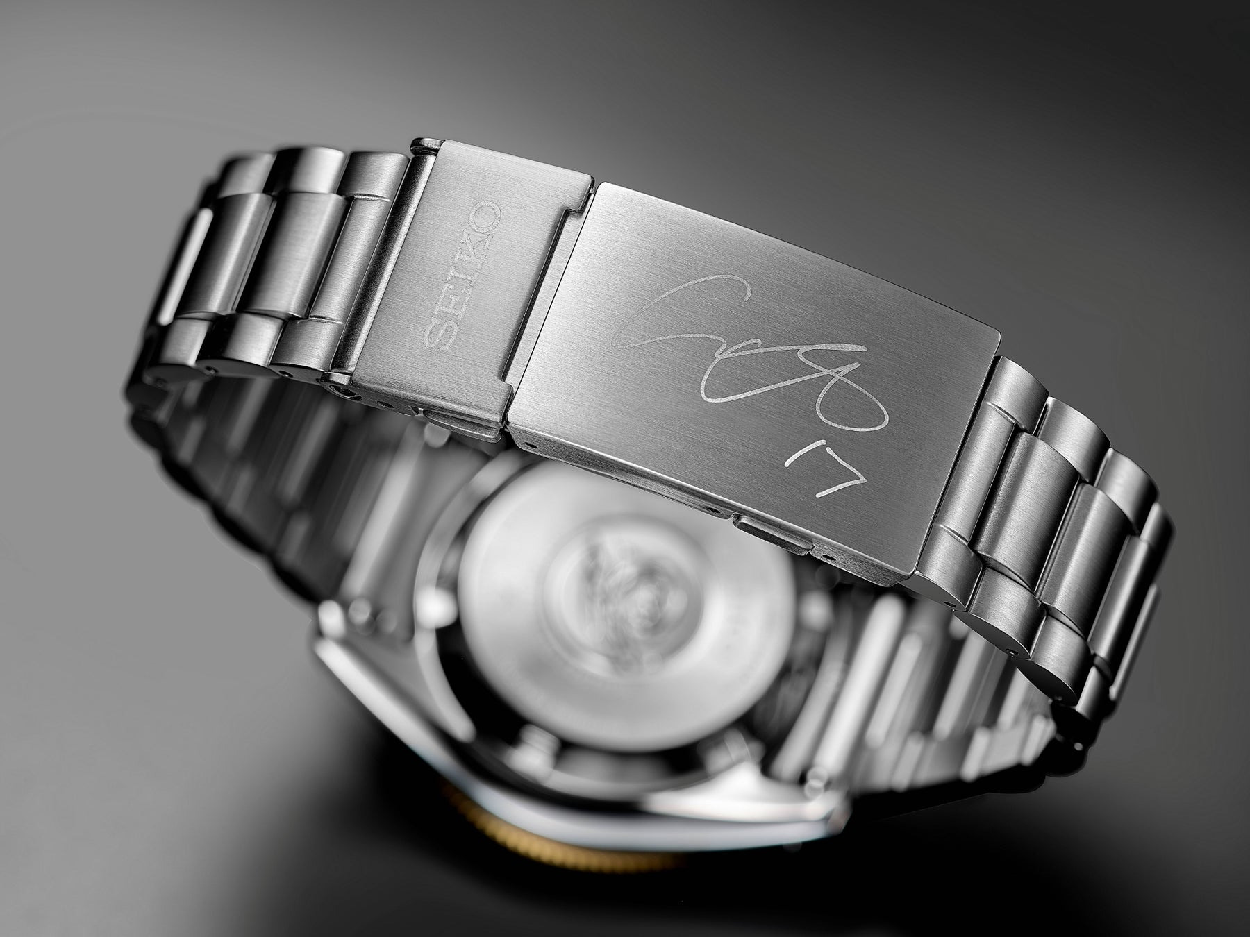 不过,除了表盘之外,您还可以发现更多限量版细节。表冠上标有大谷的球衣号码 "17",表带扣上有他的签名。表背镌刻有 "大谷翔平限量版 "字样和个人序列号。购买者还将获得印有大谷翔平签名的特别礼盒。