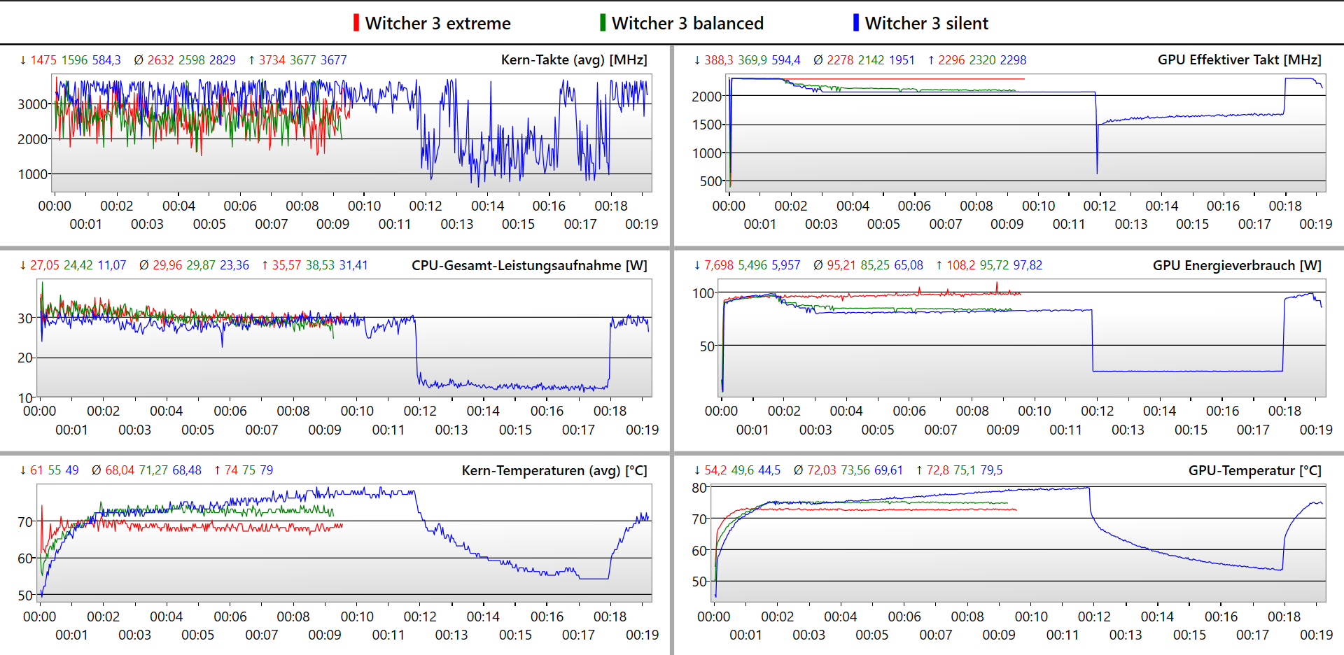 虽然Pulse 17在负载情况下的最大功耗在笔记本电脑级别中相当典型,但在空闲运行期间,甚至在中等负载情况下,我们的测试设备对于一款游戏笔记本电脑来说异常高效。