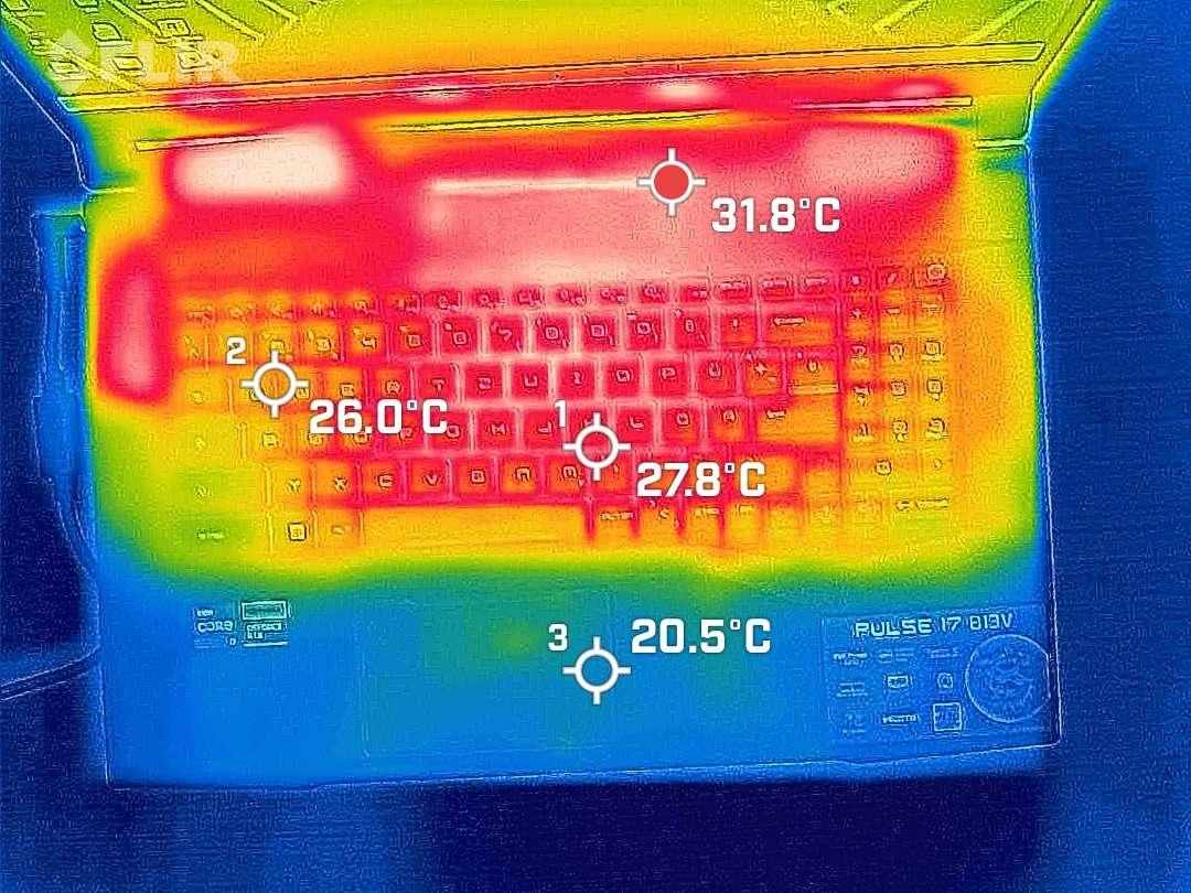 在我们的测试设备中,掌托的表面温度始终保持低温,仅略高于室温。设备的最高温度为48 °C(118 °F),分布在散热系统上方和下方的后边缘以及键盘中心的大面积区域。然而,在游戏的重要区域以及高性能游戏笔记本电脑的底部,温度仍保持在可承受的范围内。