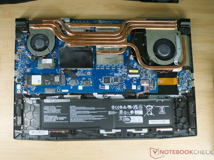 在笔记本内部,我们发现了一个相当模块化的结构,因此可以快速更换内存、NVMe SSD和WLAN/Modul。电池、扬声器和带有两个USB接口的电路板也可以轻松更换。不过,经常需要清除风扇和散热片之间灰尘的用户必须拆下整个散热系统才能进行。