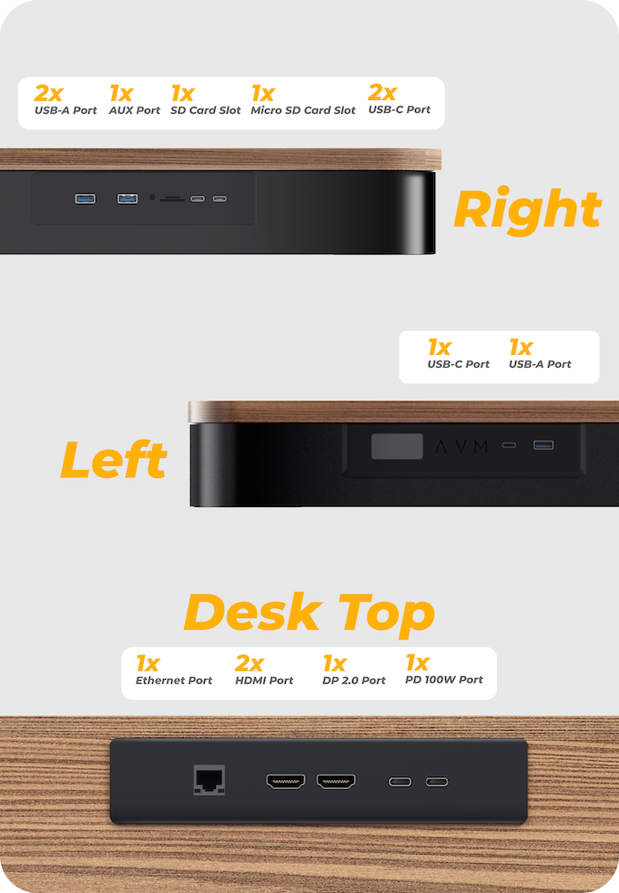 REVOXEN站立式办公桌还集成了SD和Micro SD卡插槽,传输速度为300 Mbps,还有一个可存储高达8TB的SSD外壳。这支持NVMe SSD尺寸,如2242、2260和2280。两个HDMI和一个显示端口使你能够同时连接三个显示器,你的笔记本电脑通过USB-C连接到桌面。HDMI端口允许在60赫兹分辨率下的4K,而DP 2.0输入可以处理30赫兹的8K。一个无线充电板也能让你在办公桌的表面为你的智能手机充电。