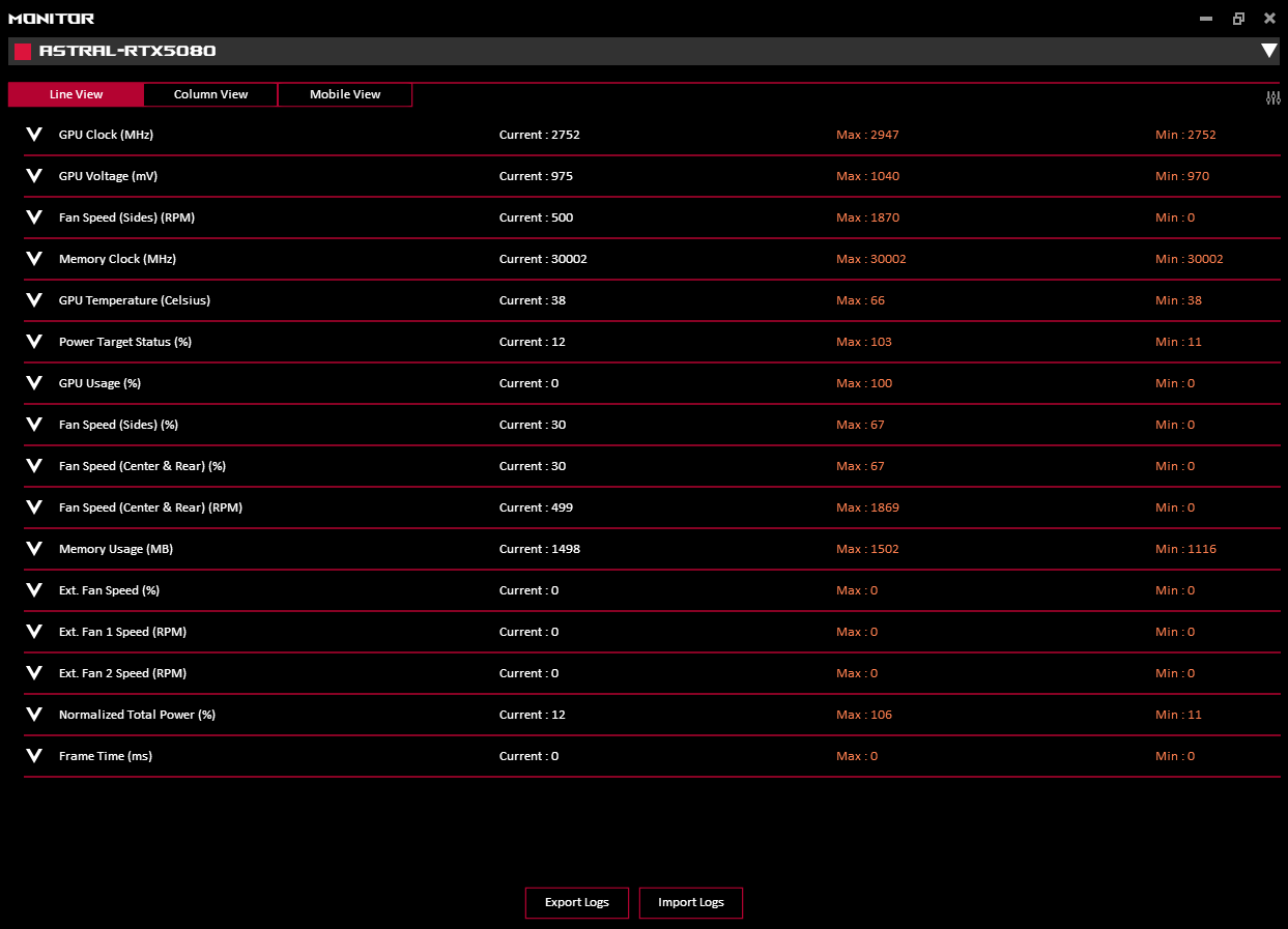 它有一个方便的 12V-2x6 状态指示器,可确认针脚是否正确就位,同时报告通过每个针脚的功率。该功能仅适用于旗舰级 ROG Astral 和 Strix 系列显卡,而不适用于以下显卡 PrimeGeForce RTX 5080 OC例如
