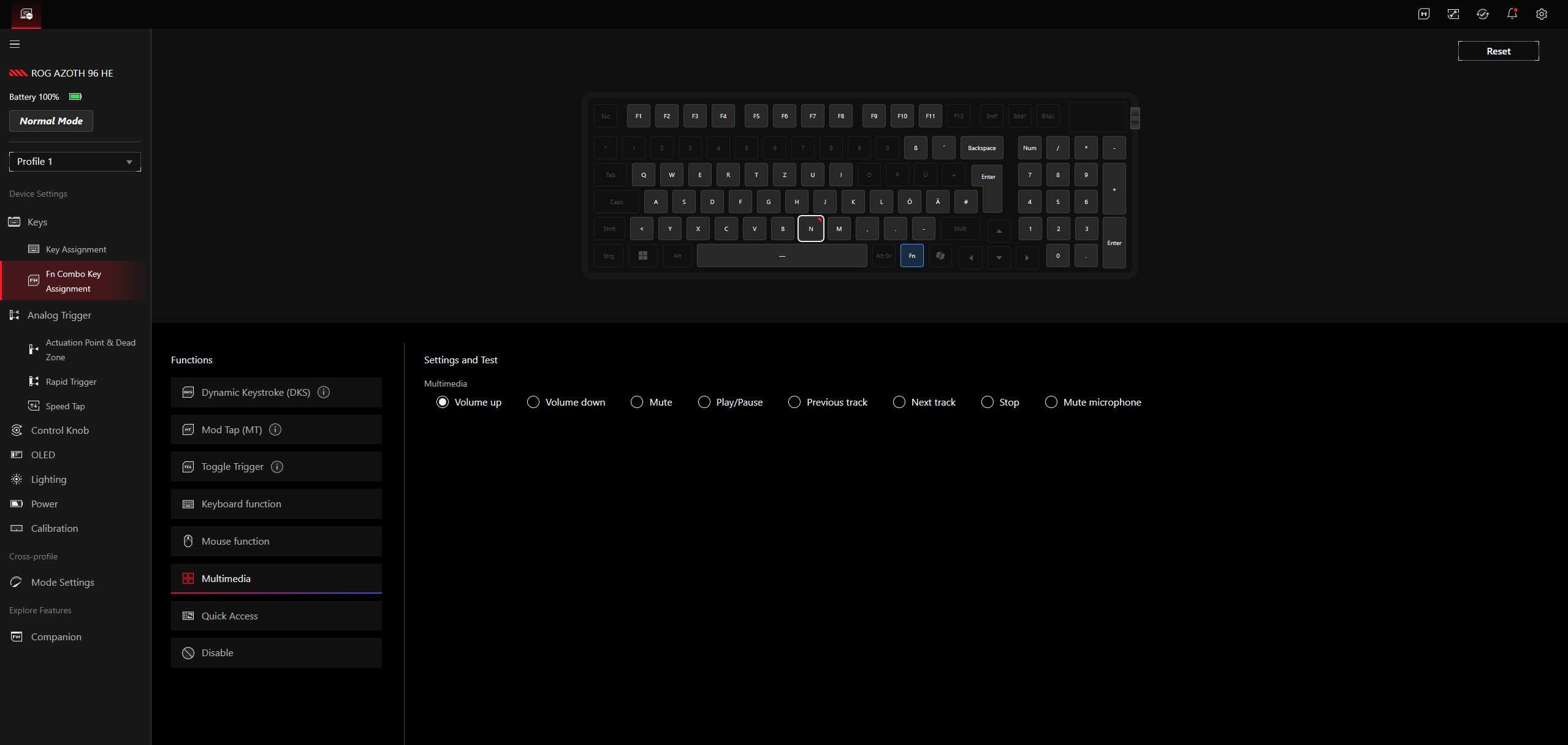 华硕 ROG Azoth 96 HE 可通过Gear Link 进行管理和配置。,它使用结构清晰的网页界面。不需要安装额外的应用程序(Gear Link Companion),但可以使用一些额外的功能。选项范围很广,例如,您可以创建多个配置文件。几乎所有的按键都可以分配不同的功能,还支持点击和按住的单独操作。此外,还可以根据按键的按压程度触发不同的功能。Fn 键可用于分配多媒体控制等功能。Gear Link 还支持为每个按键设置单独的触发点。