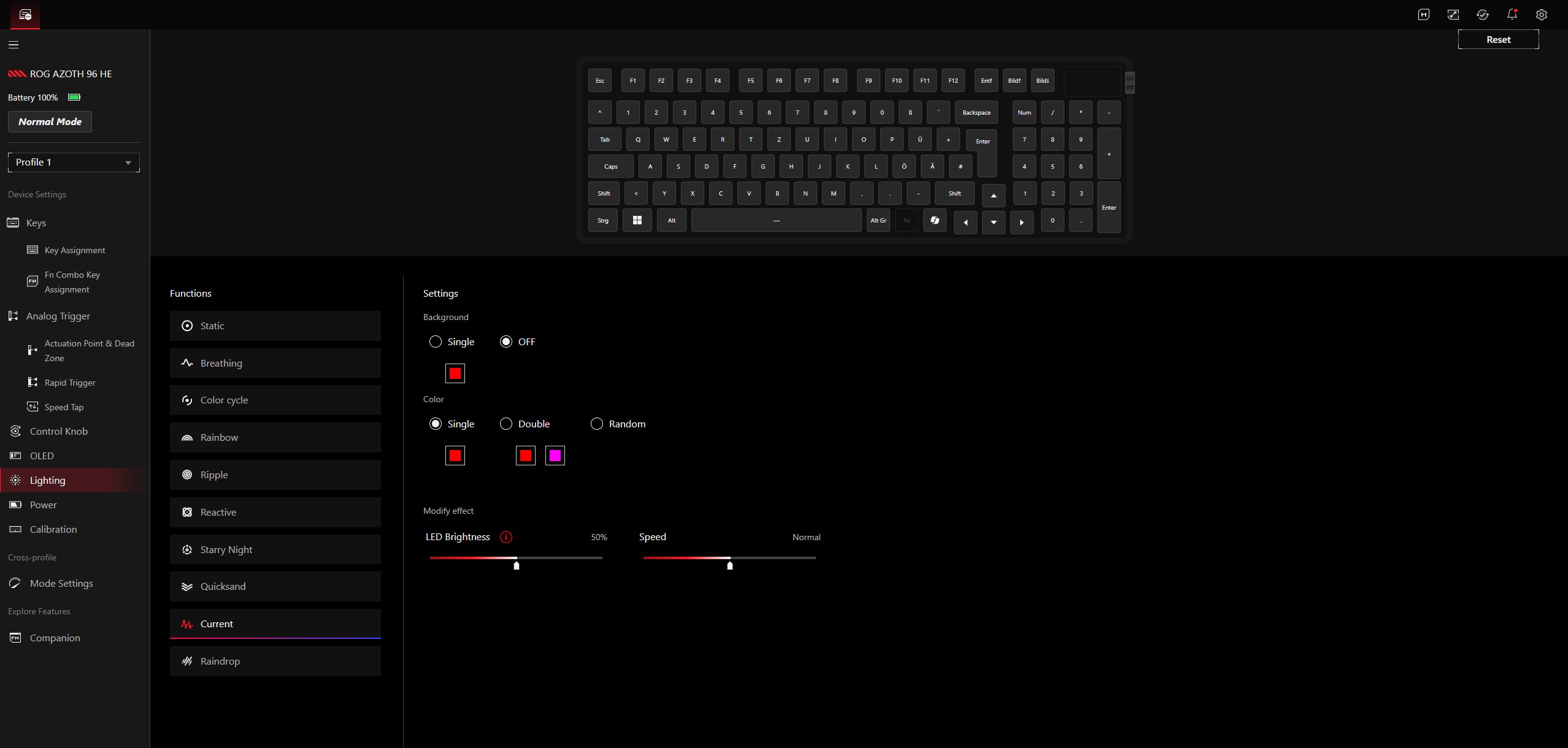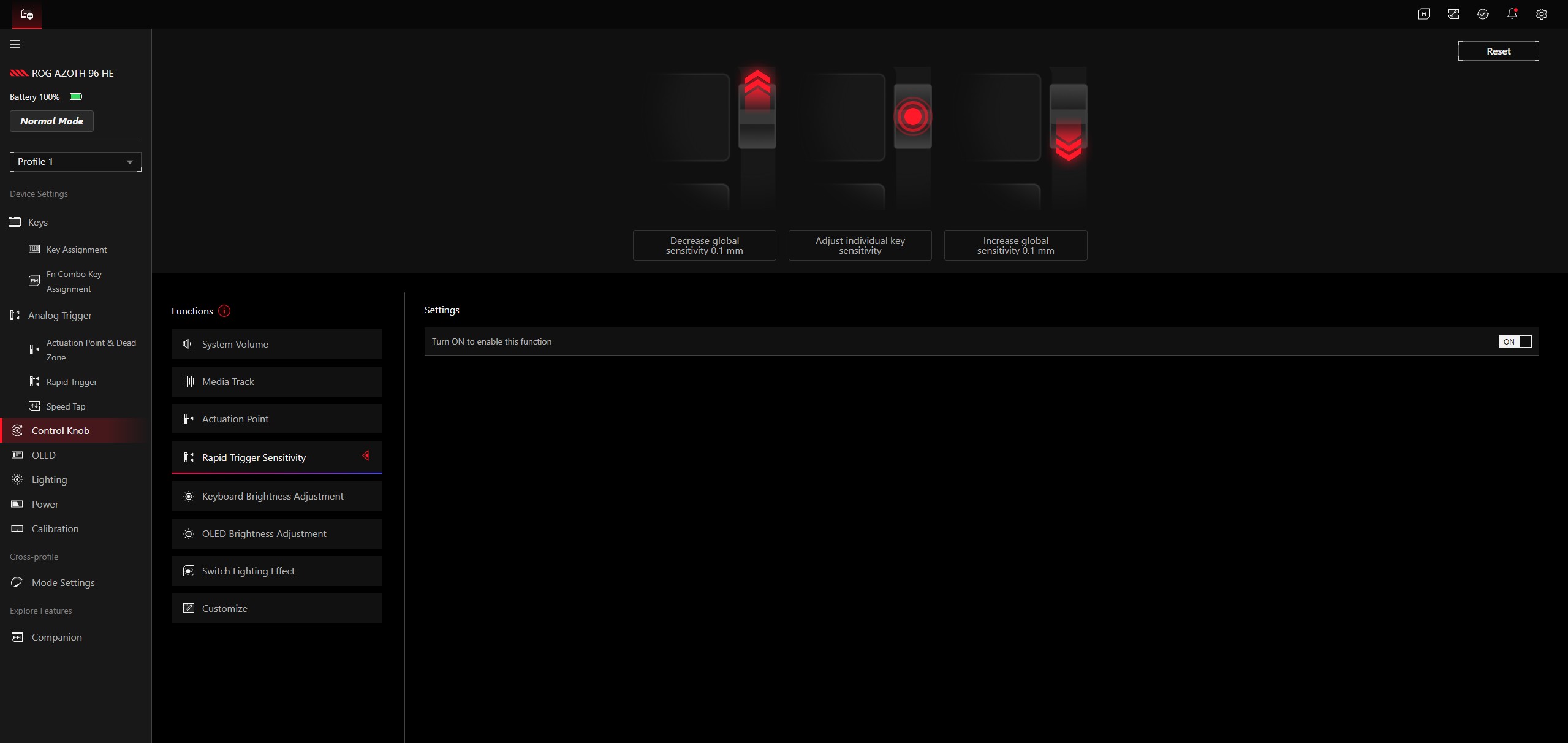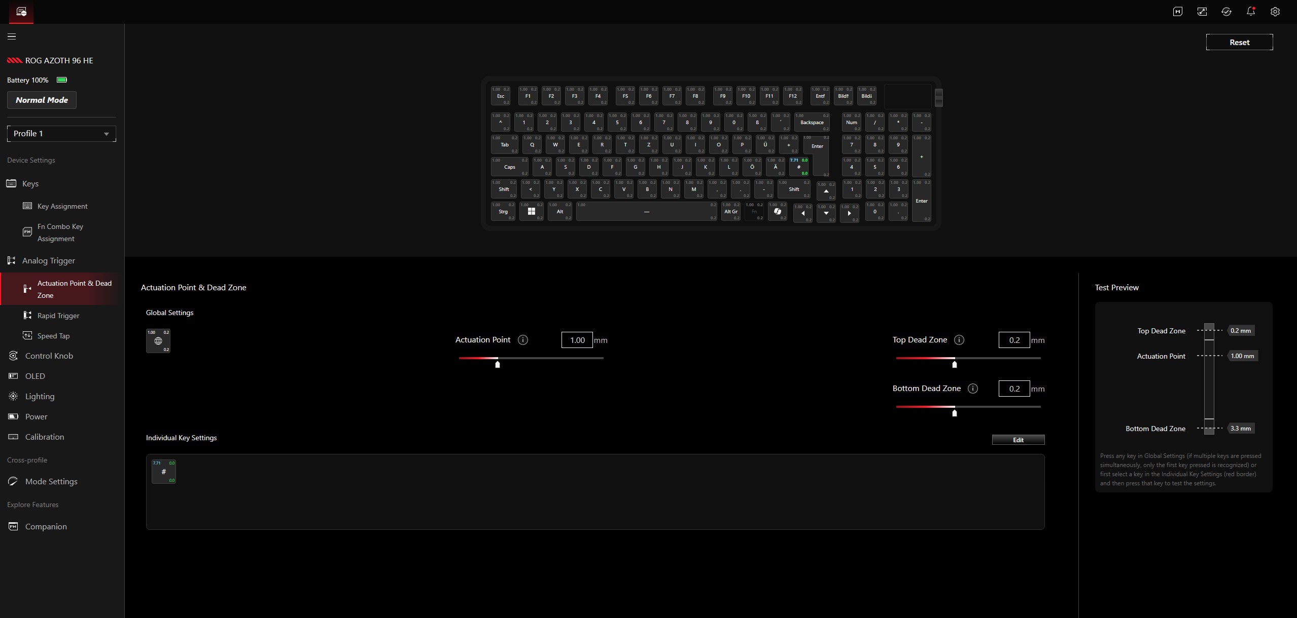 ROG Azoth 96 HE 在日常使用、生产应用和游戏中均表现出色。我们明确建议您花一些时间来设置最佳致动深度--与传统键盘相比,这种可调节性是一大优势,在实践中可以在快速致动和避免意外输入之间找到最佳平衡。致动点可在 0.1 至 3.5 毫米的范围内以 0.01 毫米为单位进行调节。