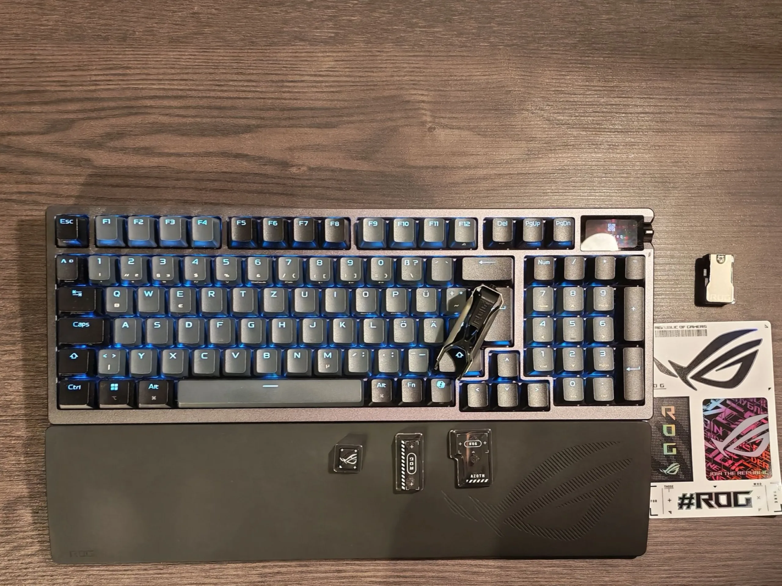 在包装盒中,华硕包括一个腕托、一条 USB Type-C 线缆、一个 USB 适配器、一条 USB 接收器延长线、一个用于替换 Copilot 键帽的控制键帽,以及三个 ROG 布局的透明附加键帽。此外,还有用于拆卸键帽和开关的工具--这两种工具可以夹在一起。设置非常简单直接,可通过 USB、蓝牙或随附的无线接收器完成。无需安装软件,即使要进行大量的配置选项也是如此--不过这一点稍后再谈。