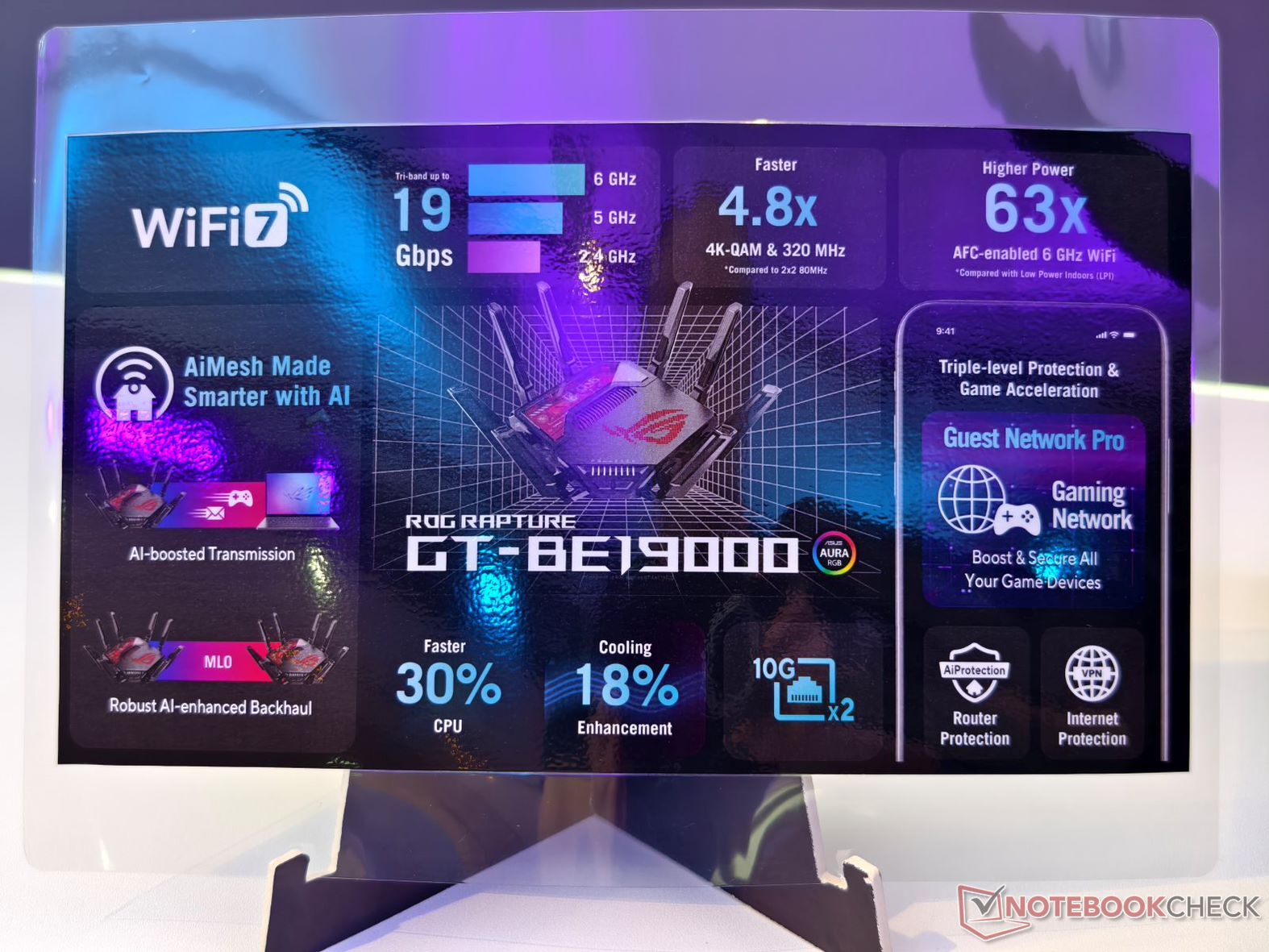 华硕 ROG Rapture GT-BE19000 保留了前代产品的玩家美学,配备八根 Wi-Fi 天线和梯形外形。华硕声称,其 Wi-Fi 7 无线电可提供高达 19 Gbps 的速度。路由器配有两个 10 Gbps 端口和四个 2.5 Gbps 以太网端口。您甚至可以将 4G LTE/5G 加密狗连接到 ROG Rapture GT-BE19000 的 USB 端口,实现不间断连接。它将所有 "以游戏为中心 "的工作负载整合到一个 SSID 中,并提供设备级保护功能,包括内置 VPN。