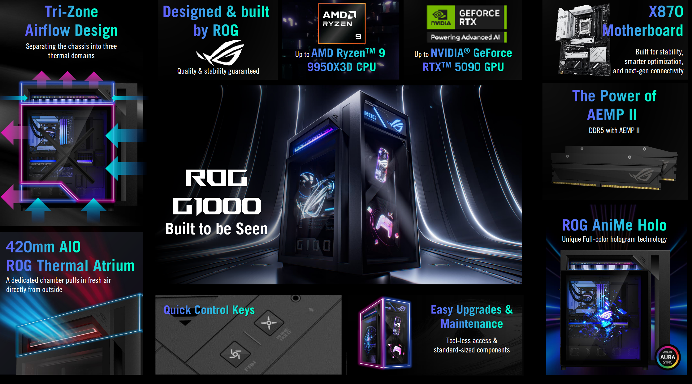 ROG G1000 最高支持 AMD Ryzen 9 9950X3D处理器,最高可搭配英伟达 GeForce RTX 5090显卡。 华硕在 ROG 自主设计的 X870 主板上构建系统。内存支持 DDR5 和 AEMP II,AEMP II 是华硕的自动内存配置文件调整功能,旨在提升稳定性和性能,无需手动配置。