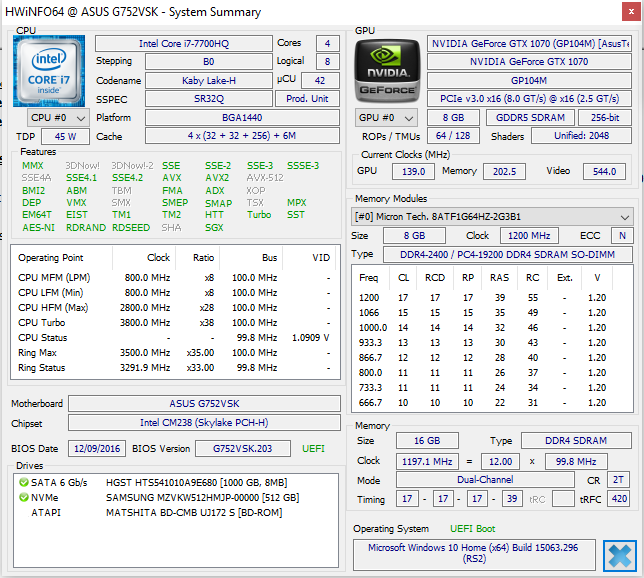 | Asus G752VS-BA338T i7-7700HQ, GeForce GTX 1070 Mobile | MSI GT72VR 7RE-433 i7-7700HQ, GeForce GTX 1070 Mobile | Gigabyte P57X v7 i7-7700HQ, GeForce GTX 1070 Mobile | Nexoc G734IV i7-7700HQ, GeForce GTX 1070 Mobile | Acer Predator 17 G9-793-70PJ i7-7700HQ, GeForce GTX 1070 Mobile | Alienware 17 R4 i7-7820HK, GeForce GTX 1080 Mobile | Asus G752VS-XB78K 6820HK, GeForce GTX 1070 Mobile | |