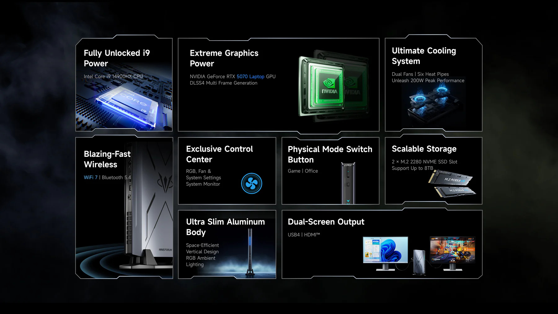 此外,AtomMan G7 Pro 只能配置一个 英伟达GeForce RTX 5070笔记本电脑 GPU,Minisforum 使用六根热管、双风扇和三面排风系统对其进行冷却。显然,这种冷却系统允许 AtomMan G7 Pro 在激活游戏模式的压力测试中消耗高达 200 W 的功率。否则,这款迷你电脑在 "办公模式 "下的功耗将高达 150 瓦。