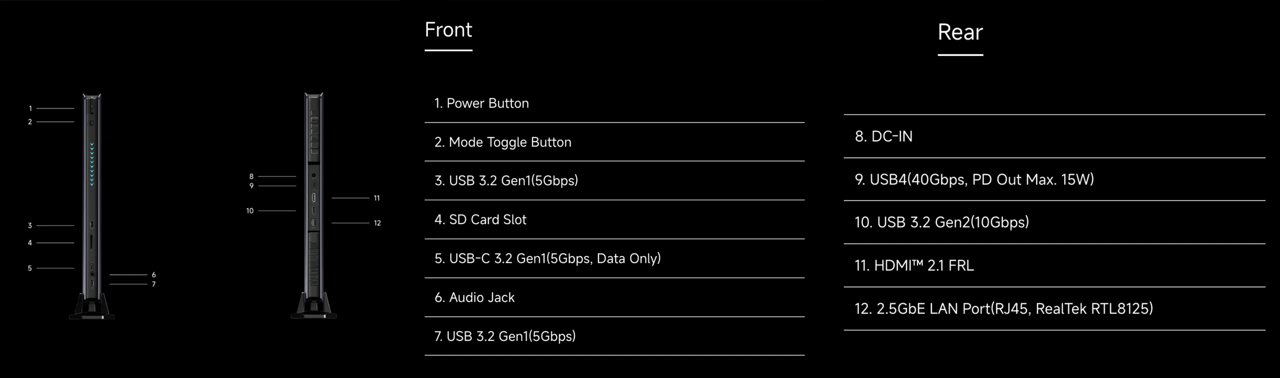 如上图所示,AtomMan G7 Pro 的端口也毫不含糊。Minisforum 为其最新的迷你 PC 定价为 1359.90 美元,裸机供那些希望自带内存和存储设备的用户使用,AtomMan G7 Pro 支持高达 96 GB DDR5-5200 和 8 TB 的内存,分两个 M.2 2280 插槽。另外,Minisforum 还出售一款预配置设备,配备 32 GB 内存和 1 TB 存储器,售价 1,679.90 美元。