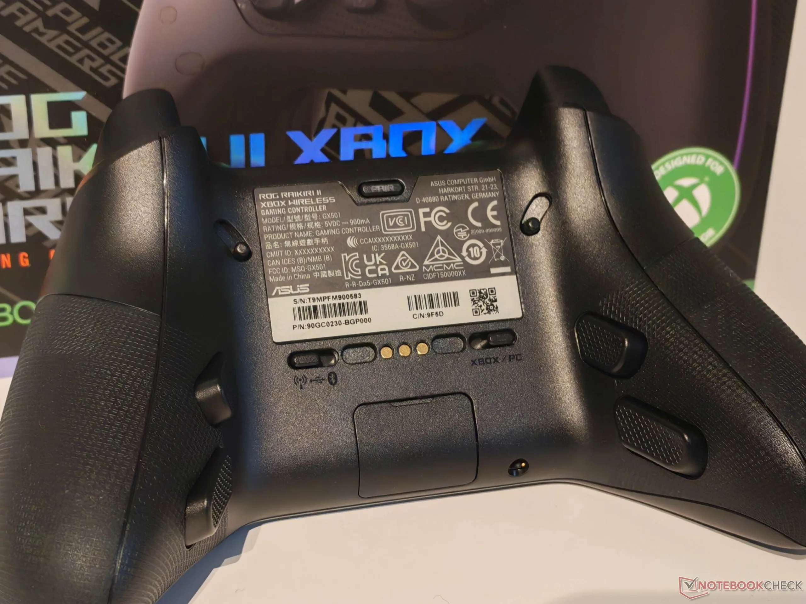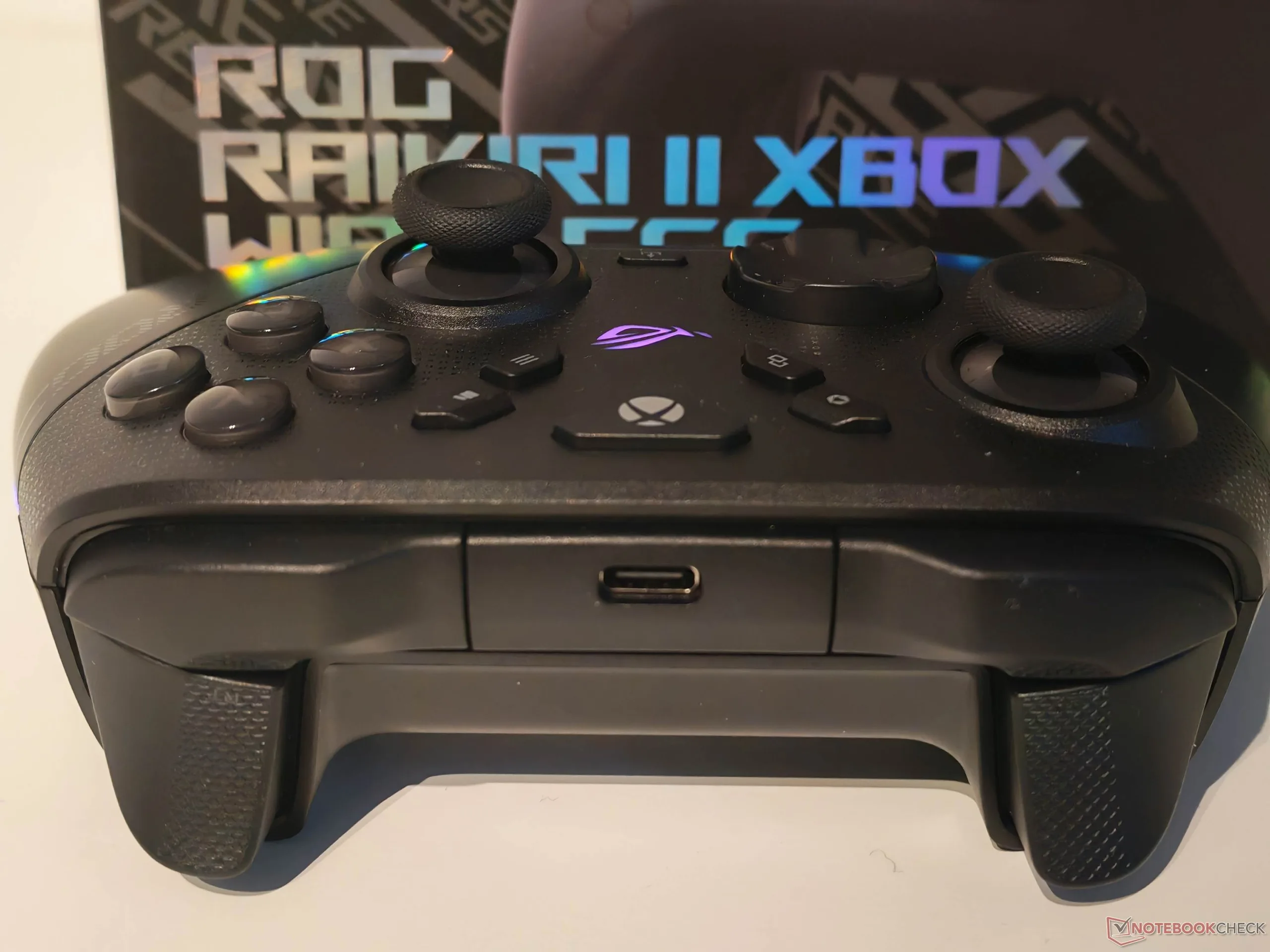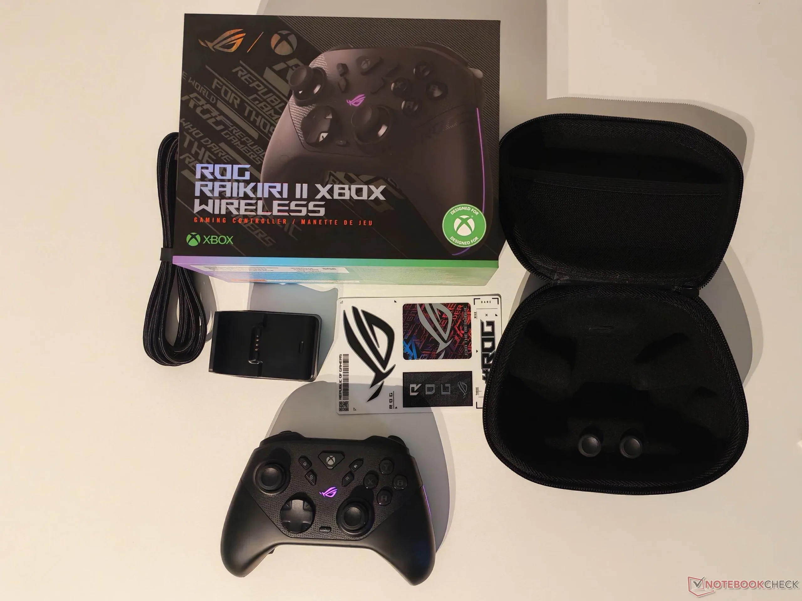 华硕 ROG Raikiri II 附带的配件非常全面。除控制器外,包装内还包括一个便携包,包内还装有充电站。由于有专门的开口,即使控制器放在包里,也可以通过 USB 充电。充电站内的充电是通过 Pogo 针进行的,这意味着 USB Type-C 端口不会受到持续磨损。