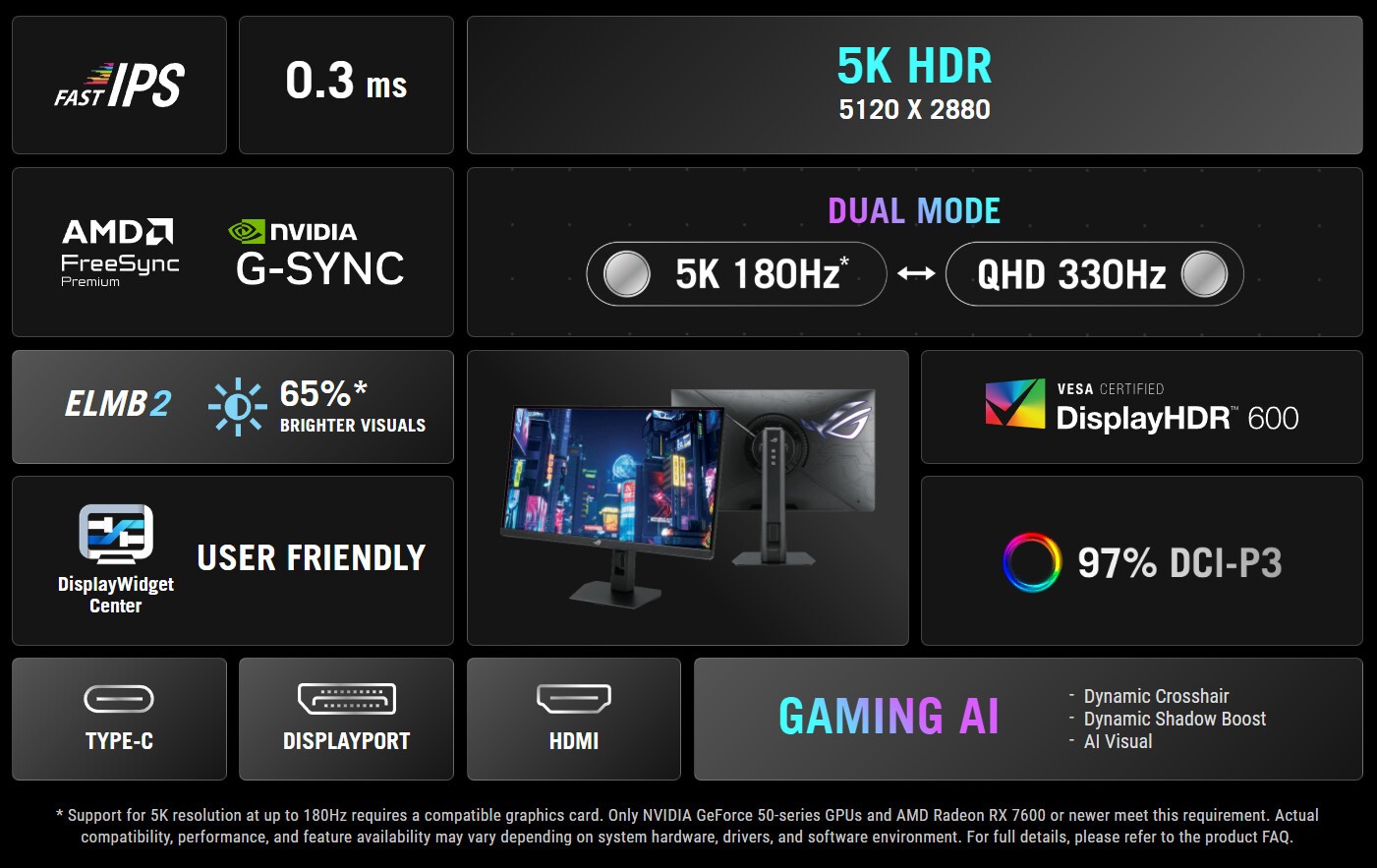 华硕 ROG Strix 5K XG27JCG 登陆北美:5K 180Hz 显示器,330Hz 模式,售价 849 美元