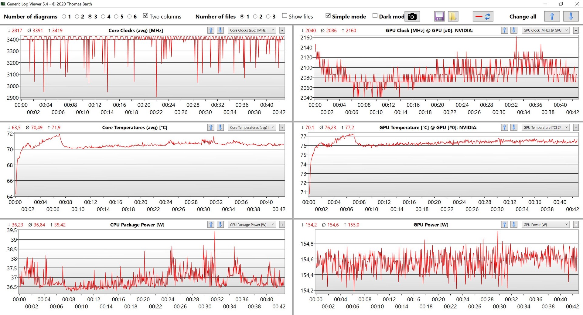 我们的压力测试有利于专用显卡,处理器将在几分钟后达到50瓦特的水平,而GPU的消耗从130瓦特上升到~140瓦特(这是Turbo电源配置文件的指定值)并保持在这个水平。这是一个不错的结果,我们没有看到压力测试后立即出现性能下降。在电池供电的情况下,CPU/GPU的综合工作负荷导致CPU消耗约43瓦特,GPU消耗约33瓦特。