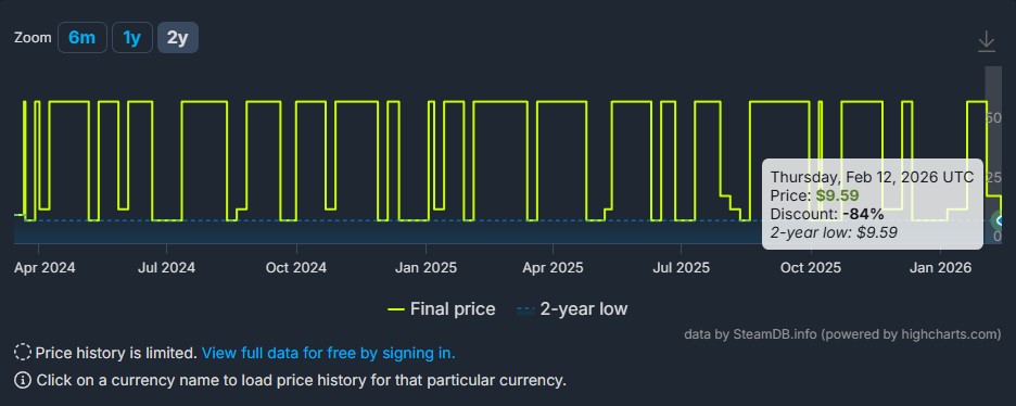 但和所有游戏一样,它也有自己的缺陷。事实上,一些玩家认为翻译和对话不佳。此外,在开放世界中旅行也很困难,而且还有许多电影镜头。最后,虽然这款游戏目前在 Steam 上的折扣为 84%,但这一优惠并不特别。在过去的几个月中,该游戏曾多次打折,详情请查看 SteamDB。