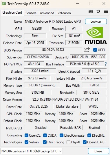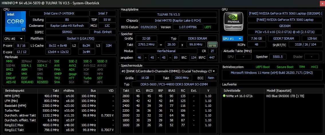 | Tulpar T6 V3.5 Intel Core i7-14700HX ⎘ NVIDIA GeForce RTX 5060 Laptop ⎘ 32 GB Memory, 1000 GB SSD | List Price: 1160 EUR | 2.4 kg | 25 mm | 16.00" 1920x1200 142 PPI IPS | |