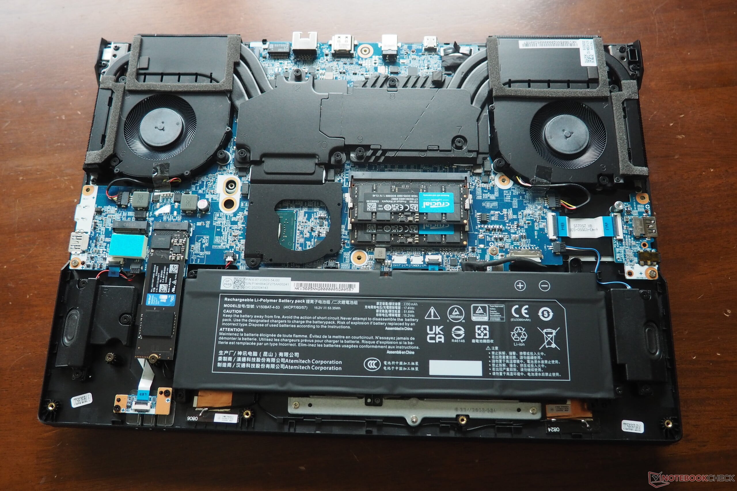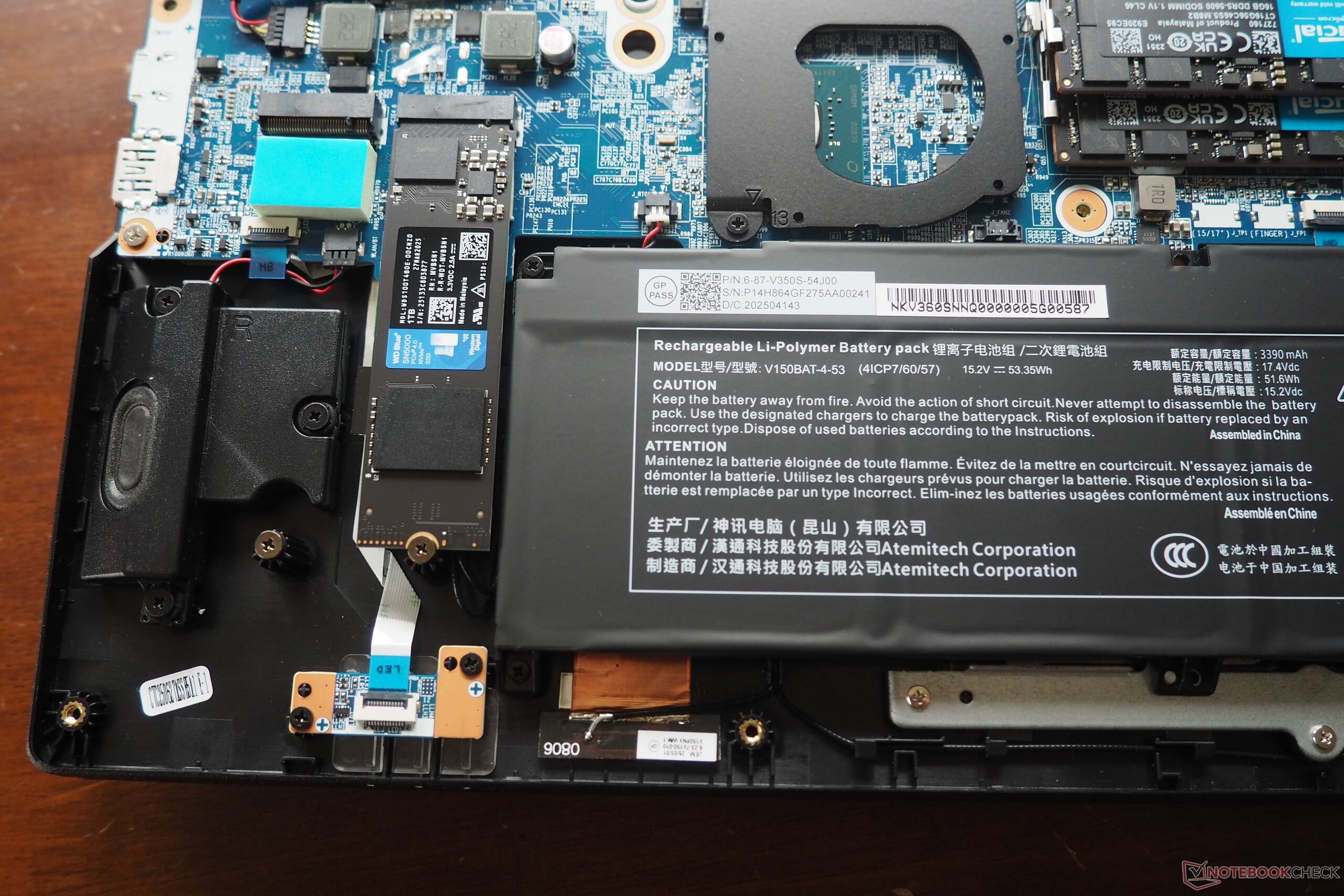 在我们的 Wi-Fi 测试中,显示屏亮度设置为 150 cd/m²,53 Wh 的电池仅持续了不到 4.5 小时,成绩一般。相比之下,竞争对手的电池容量在 70 到 96 Wh 之间,续航时间从 5 小时(HP Omen 16)到 11 小时(Acer Nitro V 16 AI)不等。