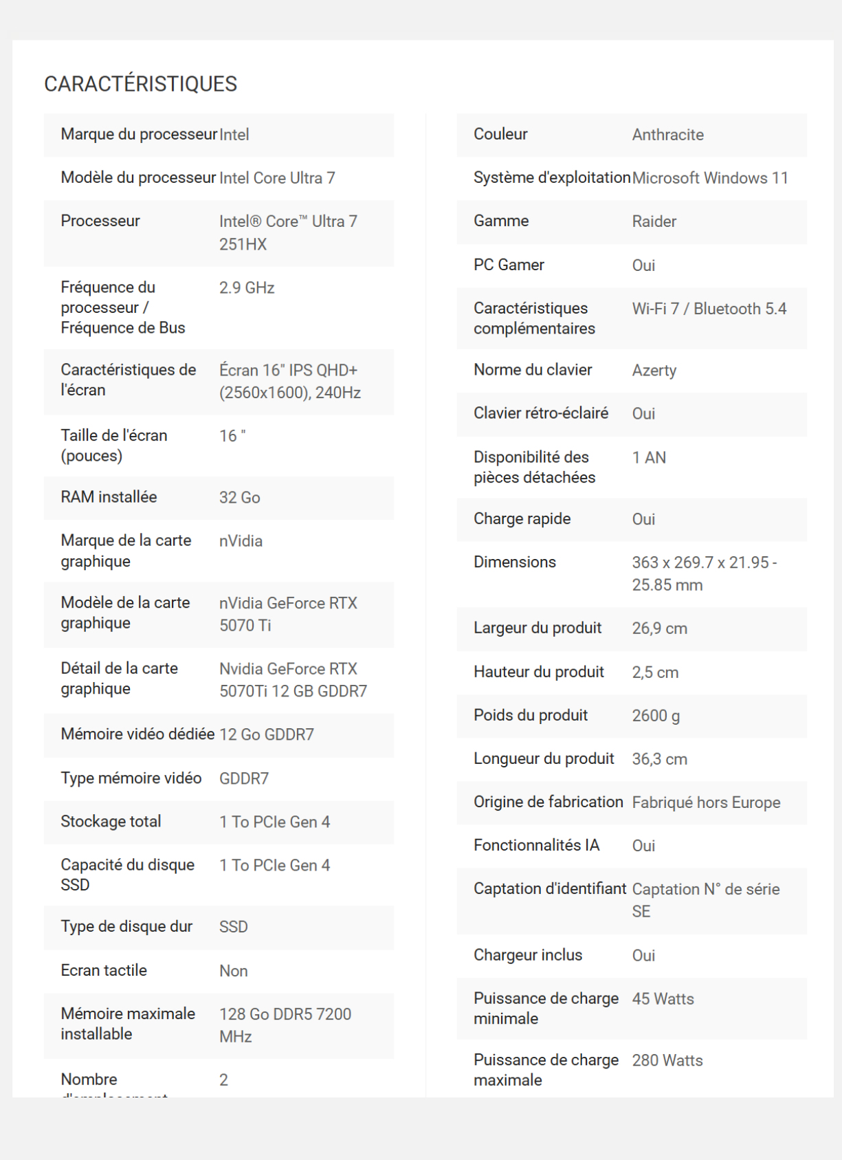现在,一系列性能较弱的搭载酷睿至尊 7 251HX 的游戏笔记本电脑似乎即将面世。作为参考,联想已经在亚马逊上销售采用酷睿至尊 7 251HX 的Legion 5i 版本。零售商 Fnac 也透露,新版 Raider 16 HX B2WH 将采用相同的处理器。