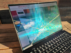 宏碁采用了三星生产的 120 Hz 的 14.5 英寸 OLED 触摸屏(2880 x 1800 像素,16:10)。OLED 的基本优势(色彩鲜艳、对比度高、响应速度快)是存在的,但触摸屏层会产生明显的光栅效应,这大大影响了主观图像质量,尤其是在明亮的内容下。我们试图在右图中捕捉这一现象,但摄像头将这一问题的恶化程度降到了最低。此外,在每个亮度级别下都会出现频率为 240 Hz 的 PWM 闪烁。亮度和色温都可以通过传感器控制。触摸屏非常容易反光,这限制了它的使用,尤其是在户外。