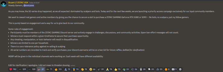 该公司基本上将获取 GeForce RTX 5090和 RTX 5080GPU 的过程本身就是一场游戏。您需要加入他们的Discord 服务器并 "积极参与挑战、讨论和社区活动"。从本质上讲,你提供的高质量参与度越高,你被选中的机会就越大。请注意,这只为您提供了购买显卡的机会,而不是免费获得显卡的机会。