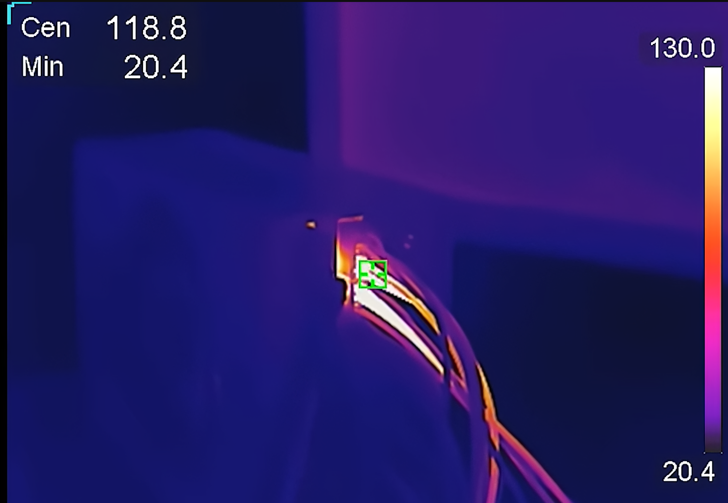 Der8auer 使用了他自己的电缆(Nvidia 提供),发现一根电缆上的电流接近 260 瓦(22 安培)。这一数字远远高于建议的 5-6 安培。热像仪图像进一步证实了这一点,热像仪图像显示 PSU 附近有一个 100 多度的热点。