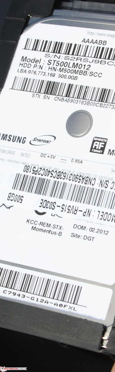 The PCMark 7 score includes 1324 system storage points. That is below-average for a 5400 RPM HDD. Current HDDs of this class achieve up to 1600 points. According to HDTune and CrystalDiskMark, the data flow rates look good (sequential read). However the access time of 19.5 ms and reading of small, scattered files is very bad. Really good 5400 RPM HDDs are 158% faster in CDM 4K Read. A Seagate ST500LM012 with a gross capacity of 500 GB is installed.