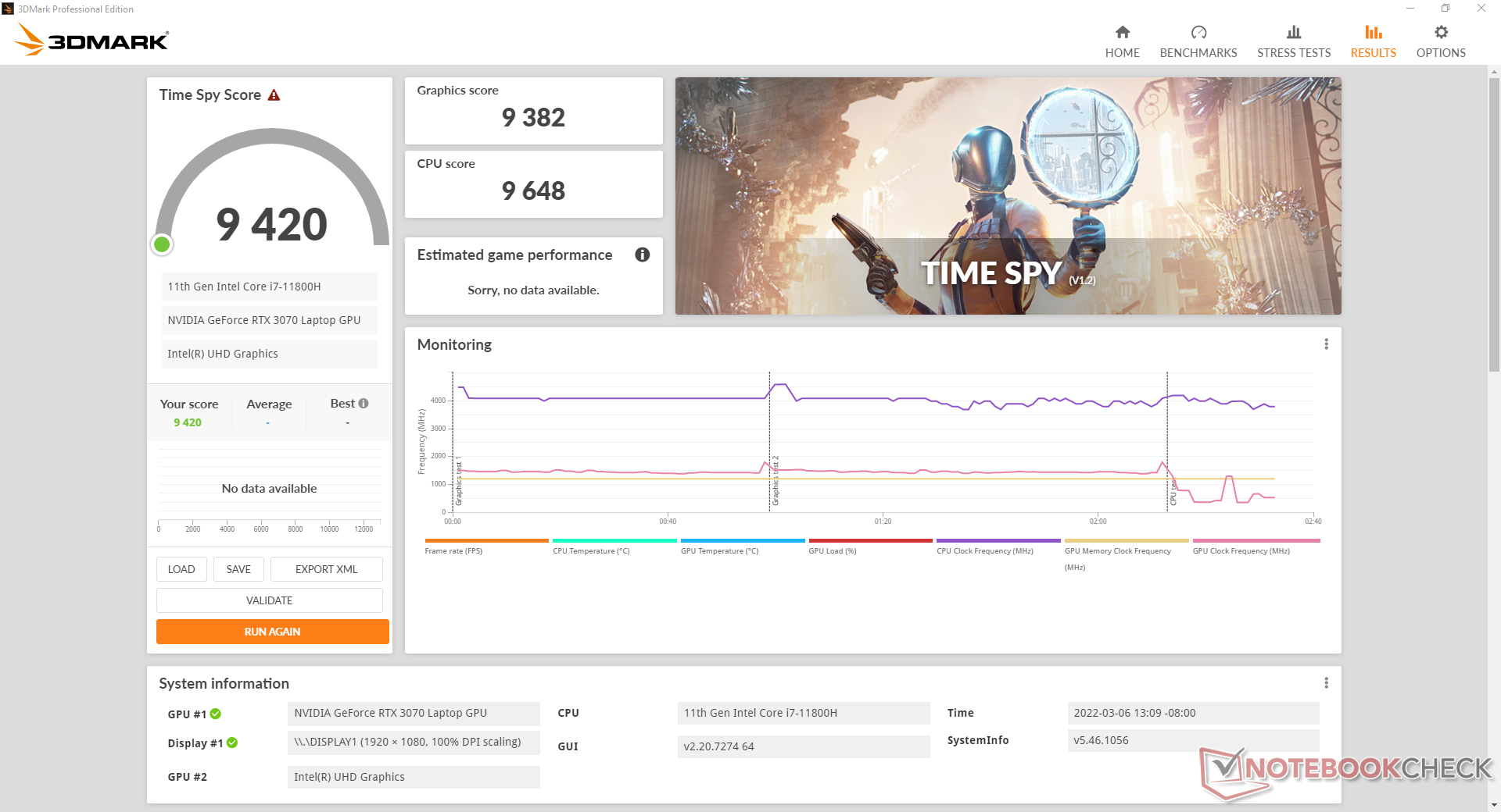 | 85.2 % v7 (old) | 03 / 2022 | Eurocom RX315 NH57AF1 i7-11800H, GeForce RTX 3070 Laptop GPU | 2 kg | 20 mm | 15.60" | 1920x1080 | |