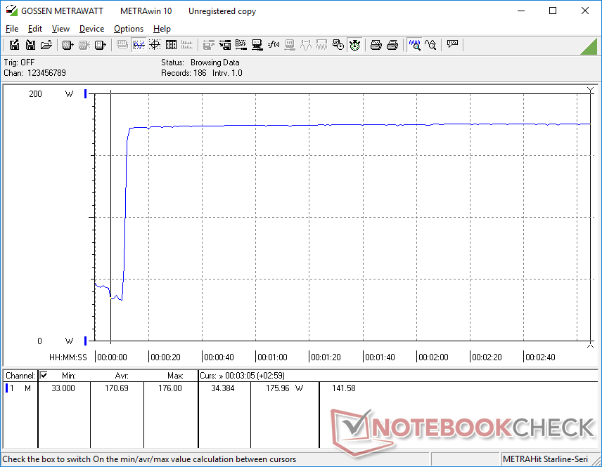 在运行游戏或其他极端负载(如 Prime95 和 FurMark)时,我们可以记录到小型 180 W USB-C AC 适配器的最大功耗为 176 W。这一点很重要,因为有限的交流适配器开销可能会对笔记本电脑的性能或充电能力造成瓶颈。在这种情况下,当运行苛刻负载时,充电速度会受到影响。例如,当连接到插座并运行时,我们可以观察到电池电量从 100% 消耗到 85%。 Witcher 3这意味着,在同时运行高负载的情况下,电池不可能以合适的速度充电。这种情况在大多数其他笔记本电脑上是不会出现的。
