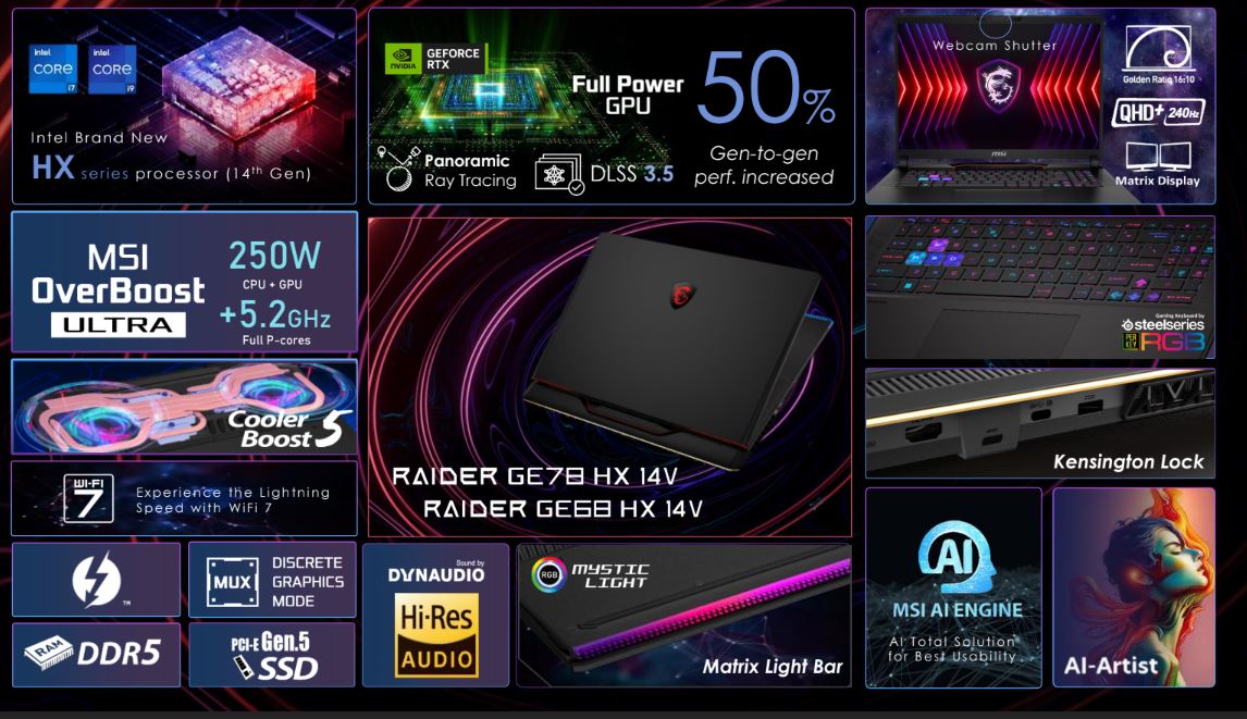 2023 年和 2024 年的 Raider GE78/68 型号之间的最大区别是,用户现在可以为 Raider GE78 和 68 HX 14V 配置最高 Core i9-14900HX CPU。在 GPU 方面,最新的 Raider GE78 和 68 HX 仍提供相同的选择,从中档的 RTX 4060 笔记本电脑到 RTX 4090 笔记本电脑 GPU。