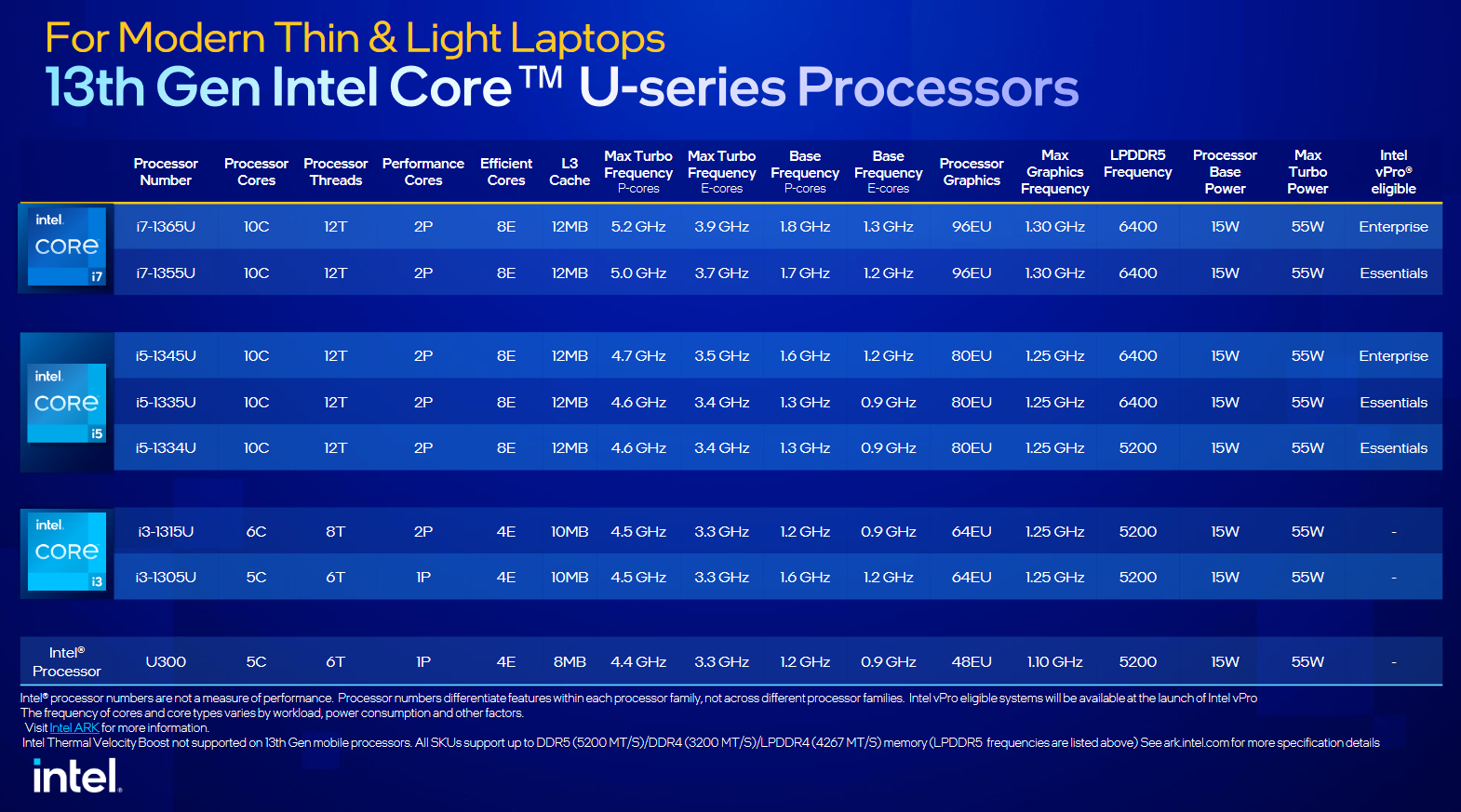 U系列的情况变得更加复杂,总共有八个SKU,从酷睿i7型号到英特尔处理器处理器都有。有酷睿i7-1365U,酷睿i7-1355U,酷睿i5-1345U,酷睿i5-1335U和酷睿i5-1334U,酷睿i3-1315U,酷睿i3-1305U和英特尔处理器U300。所有酷睿i7和酷睿i5 SKU都具有2个性能和8个效率核心。关于猛禽湖U系列的其他一切都不同,包括时钟速度、iGPU规格和L3缓存。所有SKU的共同主题是它们的额定TDP为15瓦,需要时可提升至55瓦。关于每个型号的详细信息,请参考所附图片