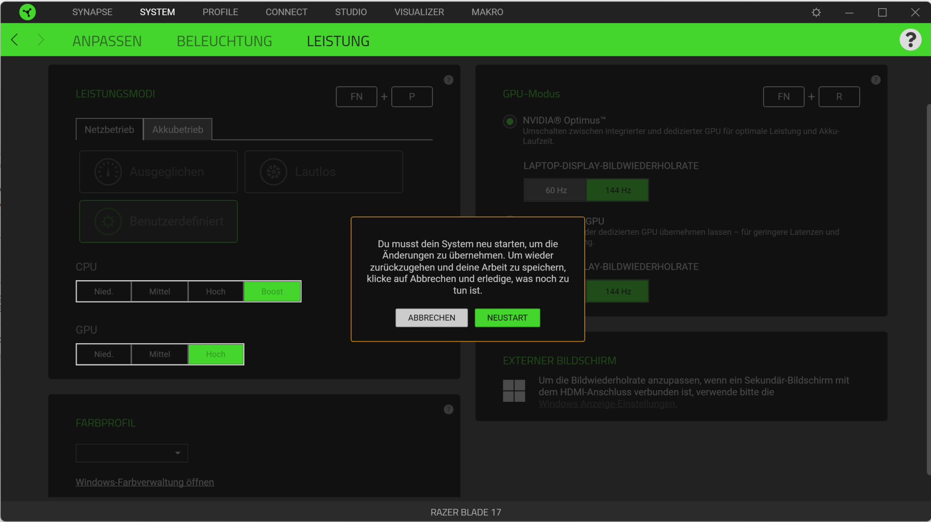 你可以通过使用 "Fn "+"P "组合键在三个可用的性能配置文件("平衡"、"静音 "和 "用户定义")之间切换。用户定义 "配置文件允许你通过Razer Synapse软件为CPU("低"、"中"、"高 "和 "提升")和GPU("低"、"中 "和 "高")设置子预设。在电池操作中,唯一可用的配置文件是 "平衡"。