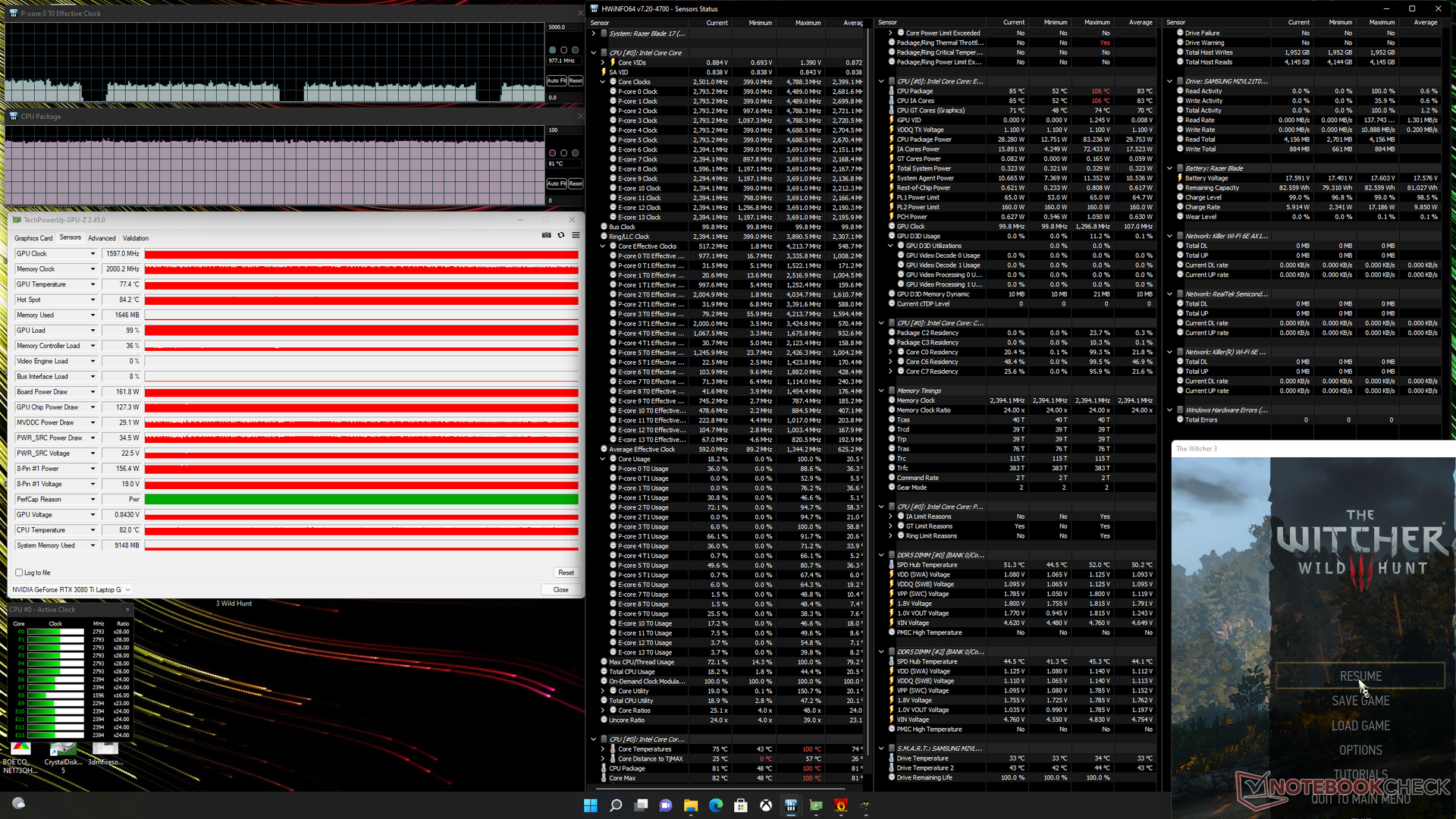 运行 Witcher 3在最大性能模式下运行将导致稳定的GPU板功耗为162W,而如果在平衡模式下则只有143W。因此,用户必须在最大性能设置下运行Blade 17,以便在游戏时尽可能多地提取性能。CPU和GPU温度将分别稳定在81℃和77℃,而配备RTX 3070显卡的第11代英特尔Blade 17的温度为79℃和72℃,或配备RTX 3080显卡的第10代英特尔Blade 17的温度为65℃和64℃。鉴于其更高的TDP和TGP目标,我们的第12代英特尔模型上更高的核心温度并不令人惊讶。