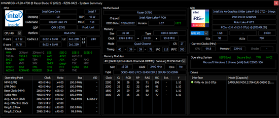 刀锋17设计是在2019年推出的,带有100WGeForce 图形。2022年的这次刷新携带了更强大的165 W GPU,而机箱的尺寸或设计没有任何重大变化。当然,性能有所提高,但总体上更高的功耗带来了更高的温度,更密集的电源砖,以及比之前采用旧处理器的Blade 17型号普遍更短的电池寿命。