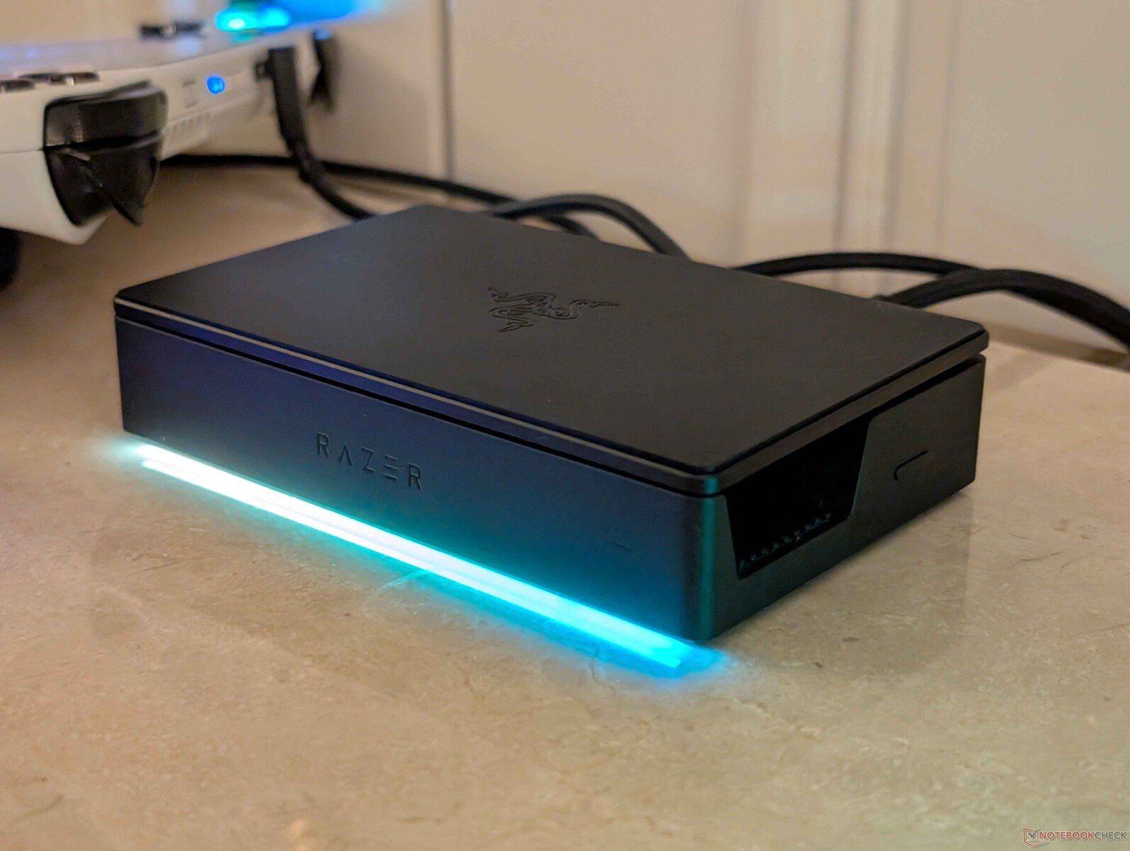 在输入/输出方面,Razer Handheld Dock Chroma 配备了一个 HDMI 端口、一个 USB-C 端口(可能用于电源砖)、一个 RJ45 以太网插孔、三个 USB Type-A 端口和一条与主机设备连接的专用矩形 USB-C 电缆。它可以通过高达 100 瓦的功率为任何连接的设备充电。还有一个电源按钮,但不清楚它是否能控制主机设备。