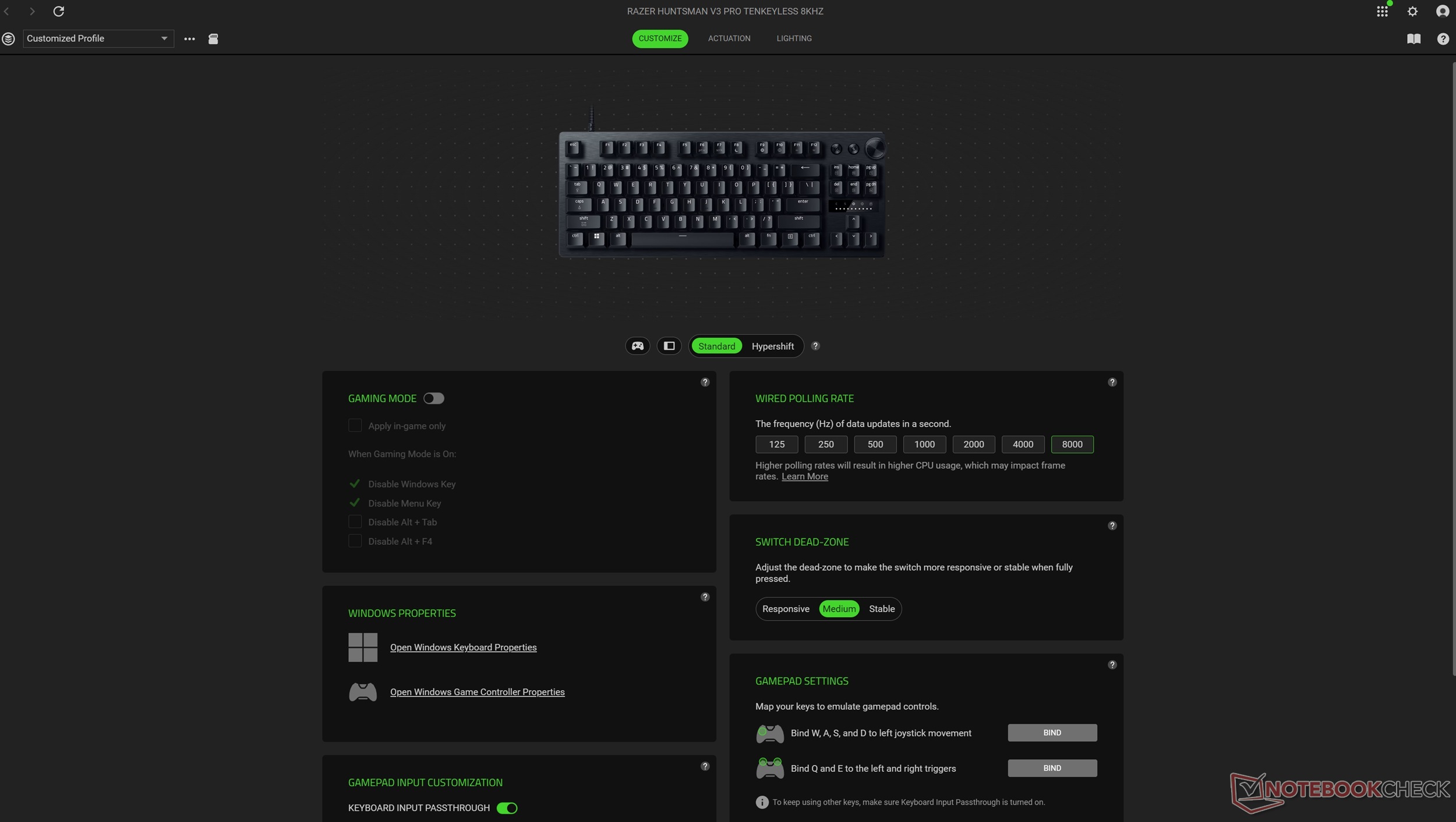更新后的 Huntsman 功能丰富,这可能会让浏览 Synapse 菜单变得困难。即便如此,Razer 还是设法将应用程序分为三个选项卡:自定义、驱动和照明。自定义 "选项卡允许玩家调整轮询率或切换选项,如打开或关闭 "游戏模式"。