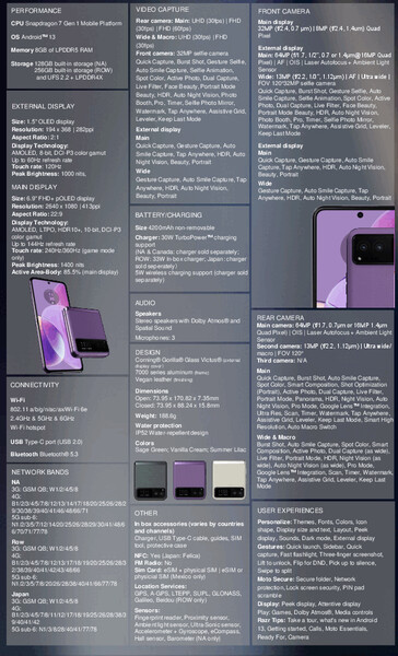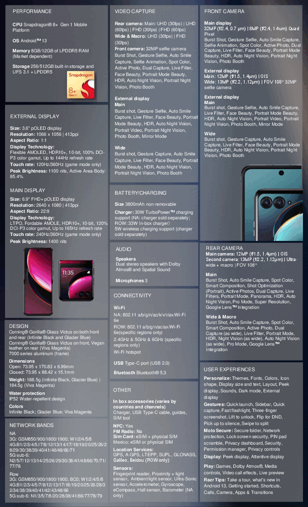 简而言之,当涉及到这对手机的规格时,没有任何惊喜,它们在摩托罗拉的发布会之前就已经广泛泄露了。因此,这两款手机都依赖上一代的骁龙芯片组,并拥有高刷新率的可折叠显示屏。请看下面的截图,了解摩托罗拉Razr 40和Razr 40 Ultra的完整数据表,这应该也适用于Razr和Razr+。作为参考,摩托罗拉已经承诺为这两款设备提供三个主要的操作系统更新,让它们在Android 16,以及第四年的安全更新。