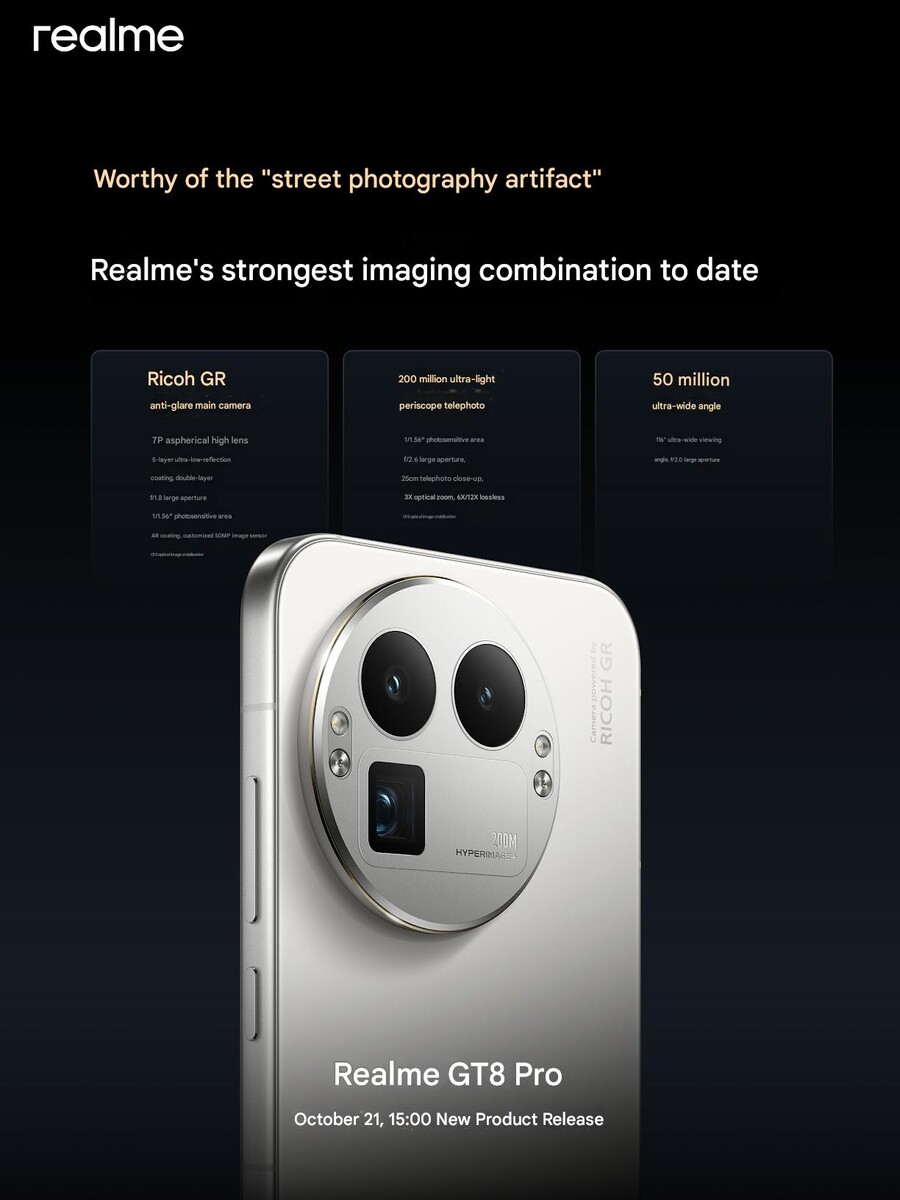 这几天,Realme 副总裁在微博上非常活跃,在这款理光 GR 摄像头旗舰将于 10 月 21 日正式亮相之前,他分享了 Realme GT 8 Pro 的大量技术规格。在即将发布的 Realme 智能手机上,一些细节和骁龙 8 Elite Gen 5 SoC 已经得到确认,而电池规格、机身、摄像头和其他一些方面也有进一步的信息。