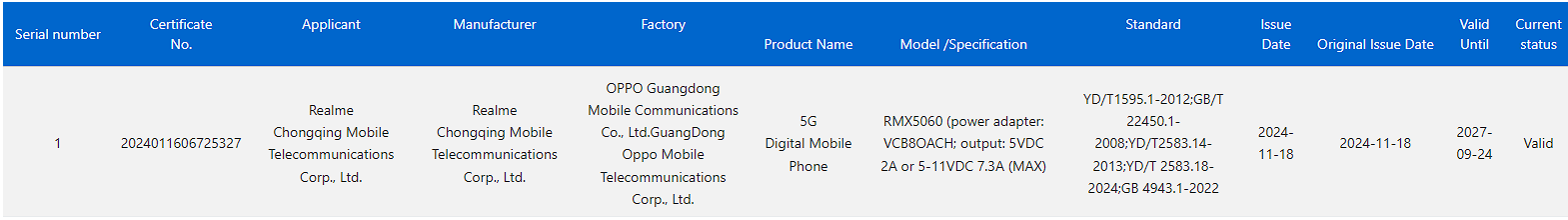 3C 认证网站上出现了一款型号为 RMX5060 的神秘设备。被猜测为 Realme GT Neo 7。认证显示,据称 Realme GT Neo 7 将是一款 5G 智能手机。此外,认证还显示该手机的充电器支持高达 80W 的快速充电。