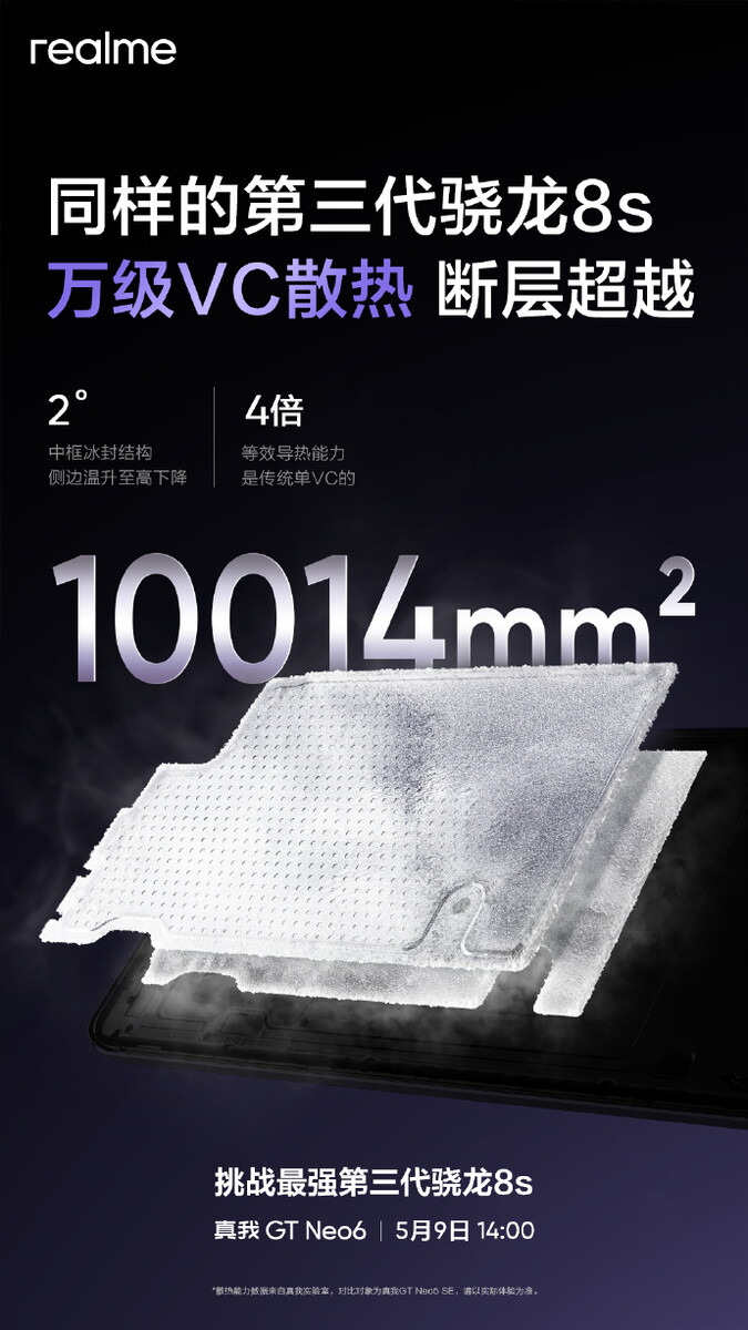此外,GT Neo6 将配备 "8T "LTPO OLED 显示屏,峰值亮度达到惊人的 6000 尼特。不过,这个数字可能只适用于一小部分显示屏;Realme 尚未确认全部面板亮度。除其他细节外,Realme 还透露了手机被动冷却解决方案的尺寸。不过,它的显示屏尺寸、内存容量和摄像头硬件等其他要素目前仍不清楚。