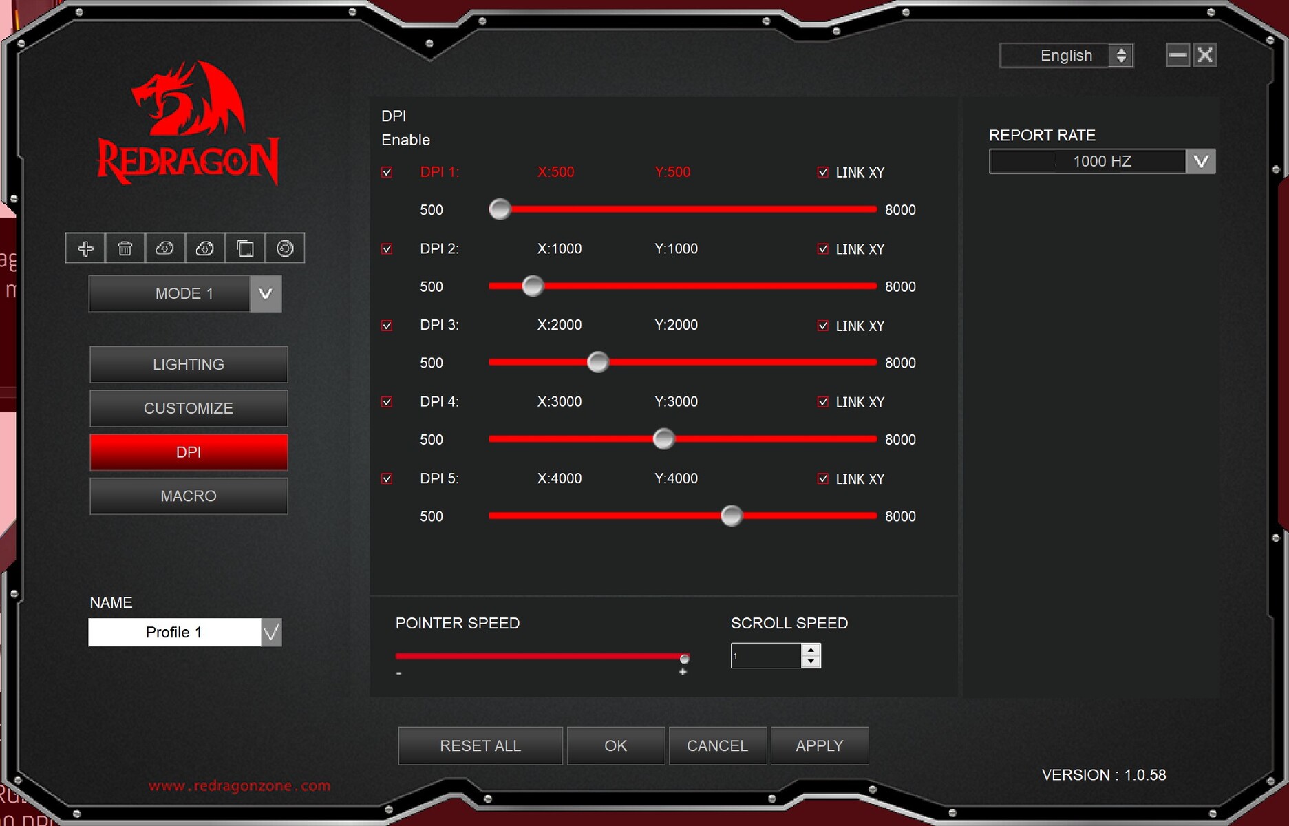 鼠标软件提供了九种RGB效果,也可以通过鼠标顶部最后面的按钮进行切换,还可以定义宏并调整DPI和刷新值,例如用于办公和游戏。总共有五种DPI模式可以部分停用,这样,如果你只需要两种模式,就不必在所有模式中切换。